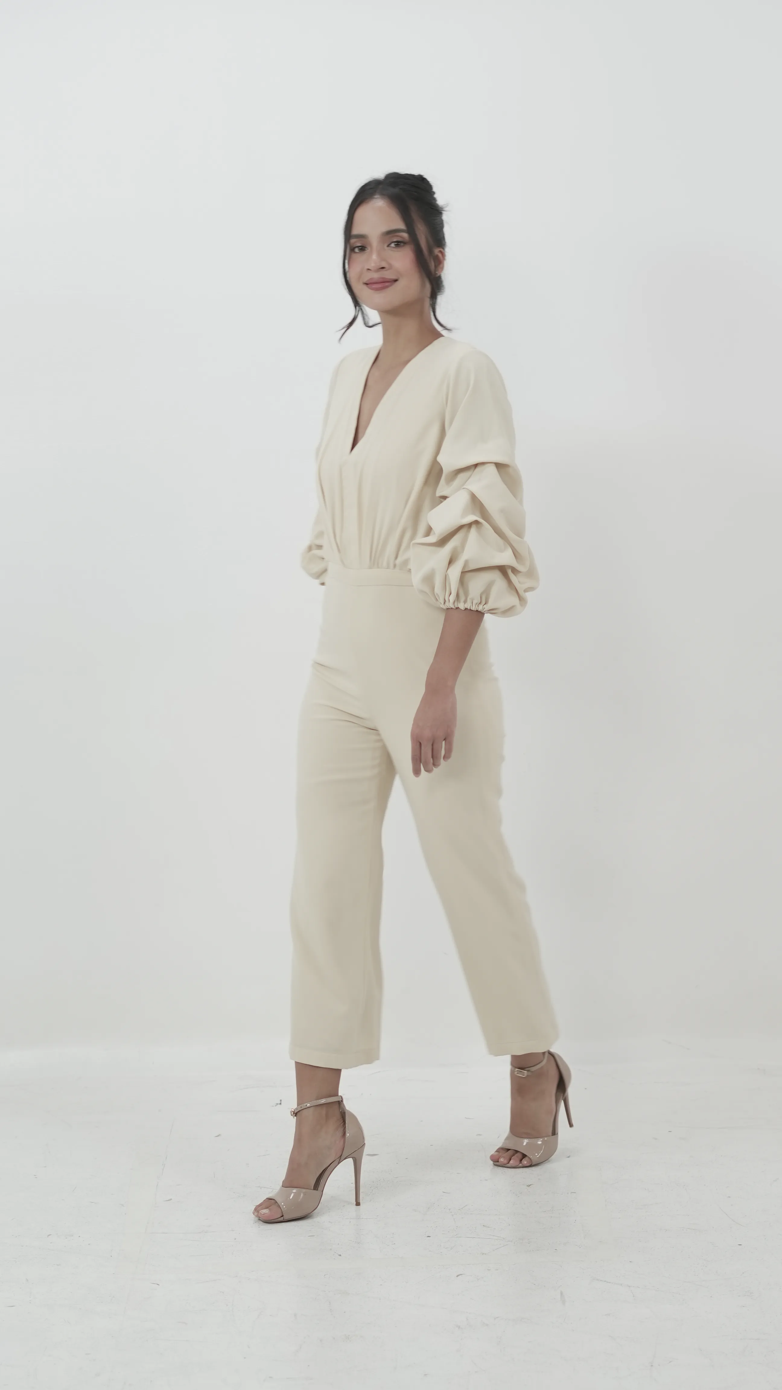 Beige V-Neck Jumpsuit with Puff Sleeves