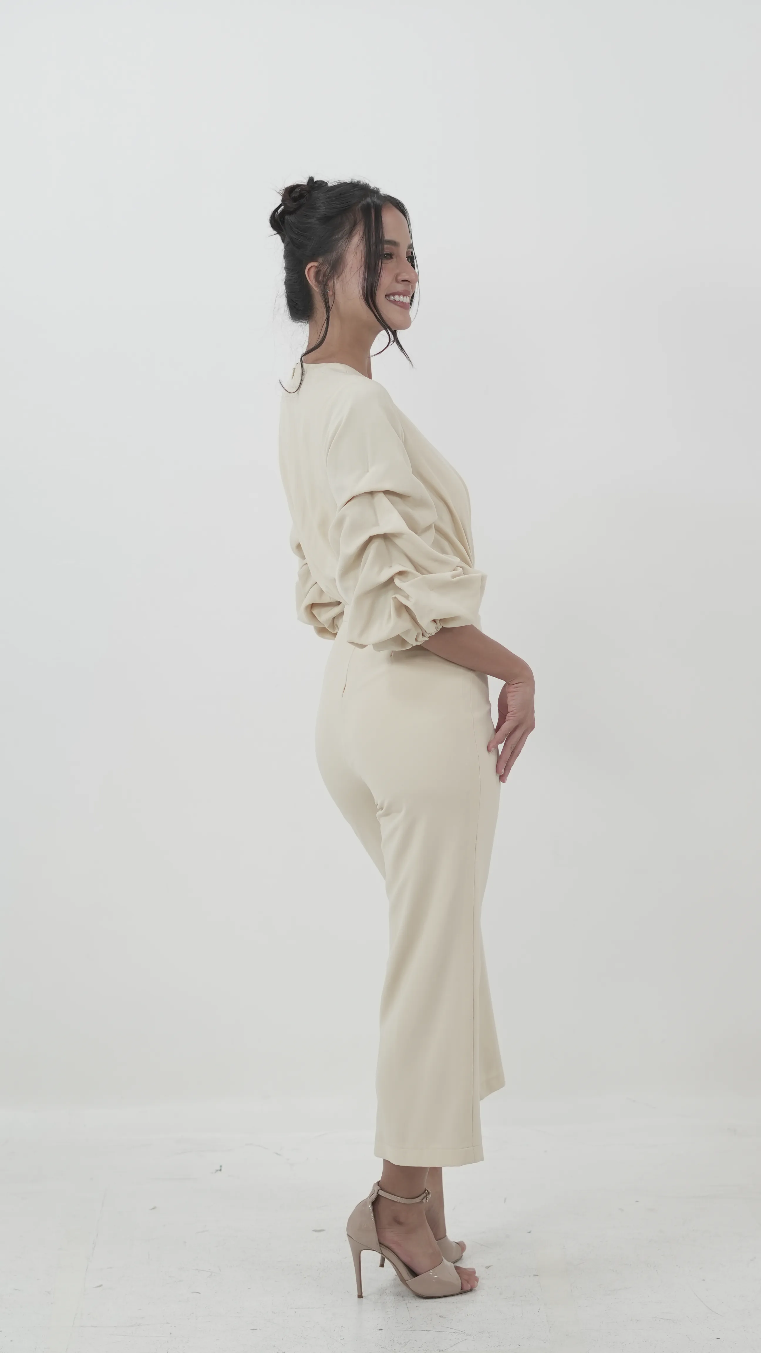 Understated yet powerful, this cream jumpsuit features voluminous ruched sleeves, a deep V neckline, and wide-leg cropped pants. A chic alternative to traditional dresses and eveningwear.