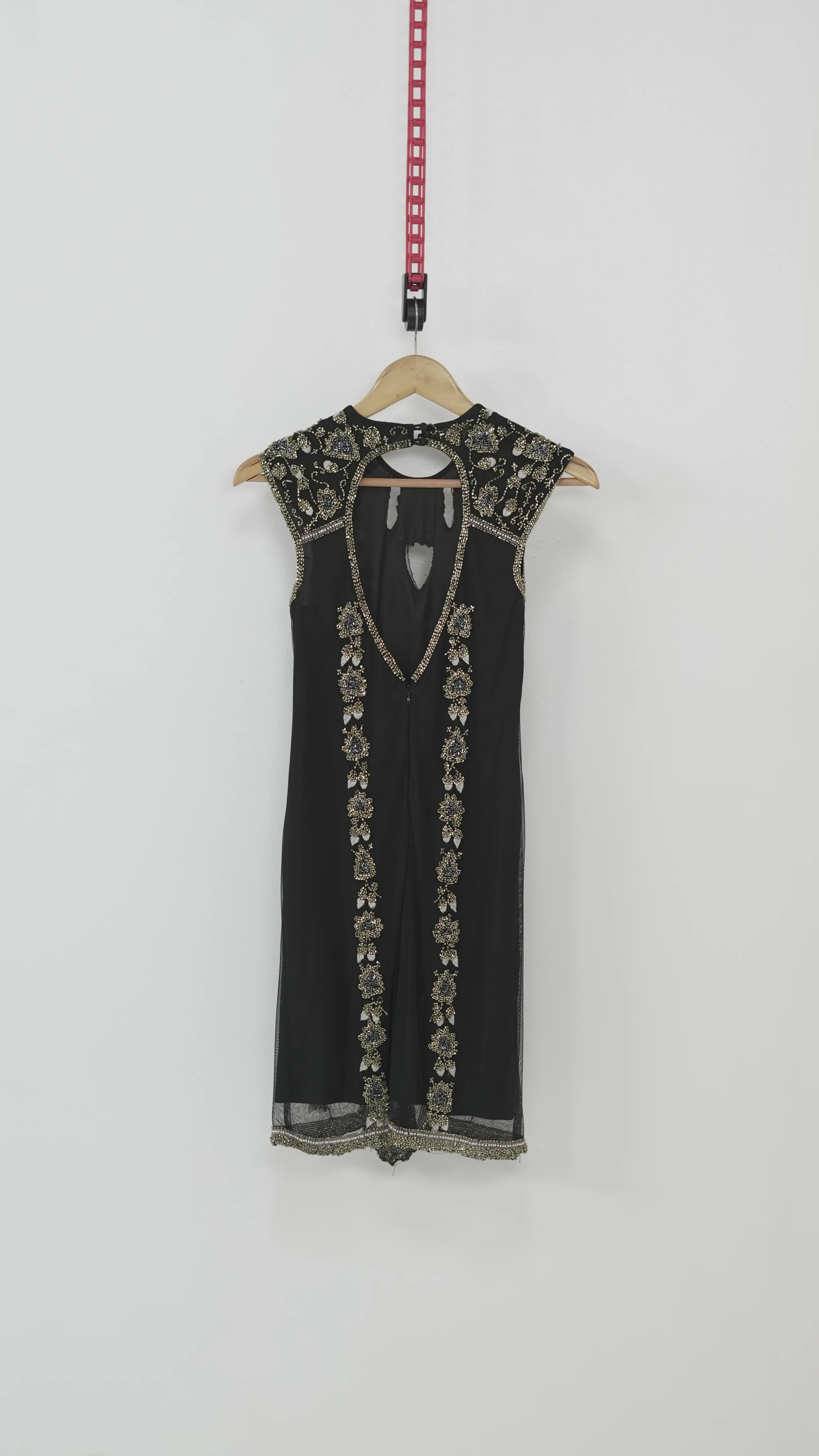 This black mini dress is richly decorated with gold embroidery and beadwork in a striking Art Deco pattern. A glamorous choice for themed events or formal dinners.