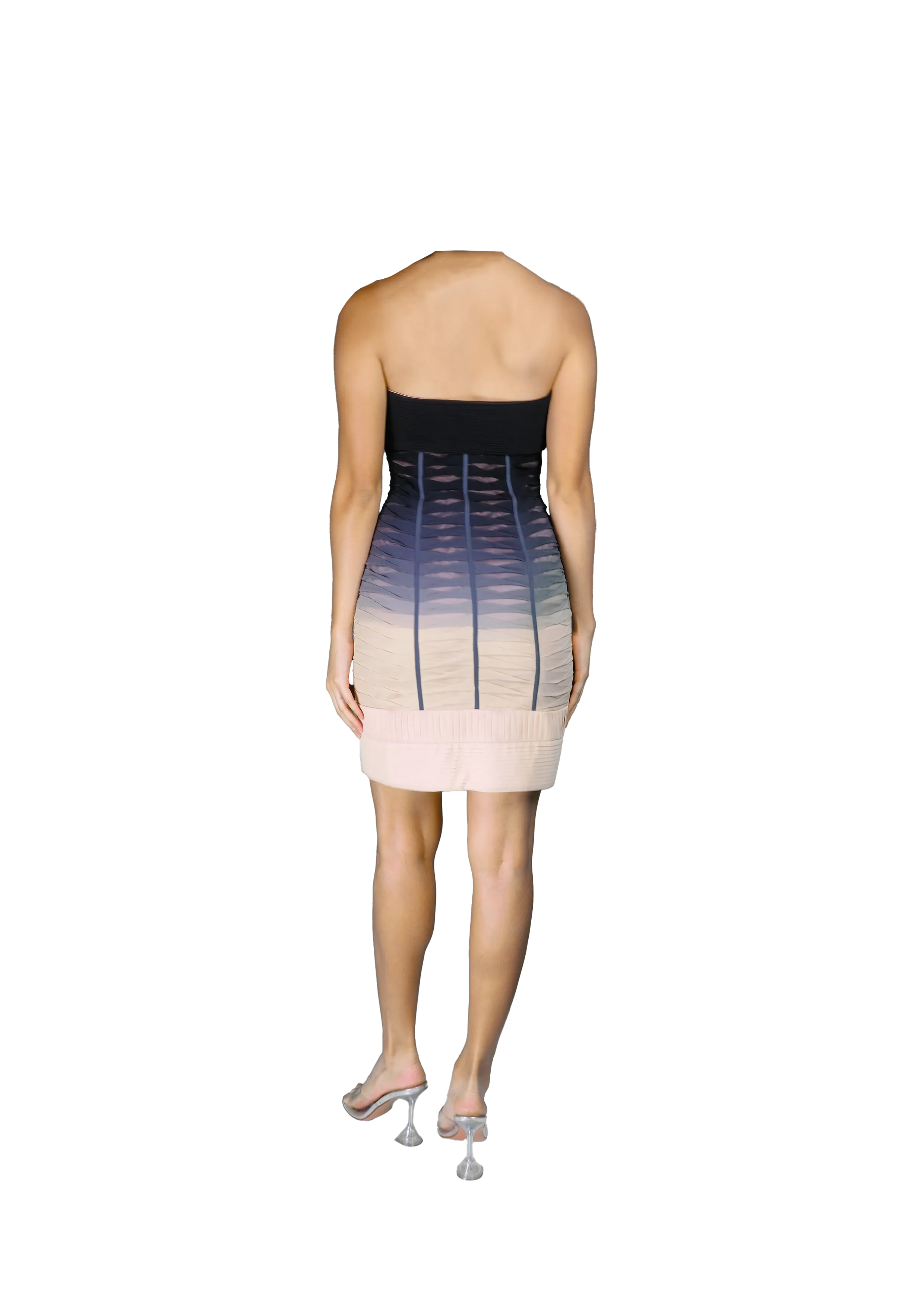 A fitted bodycon dress with a black bustier-style top and ombre skirt fading to a nude hem. The bold gradient effect is complemented by delicate gathering along the body for a flattering fit.