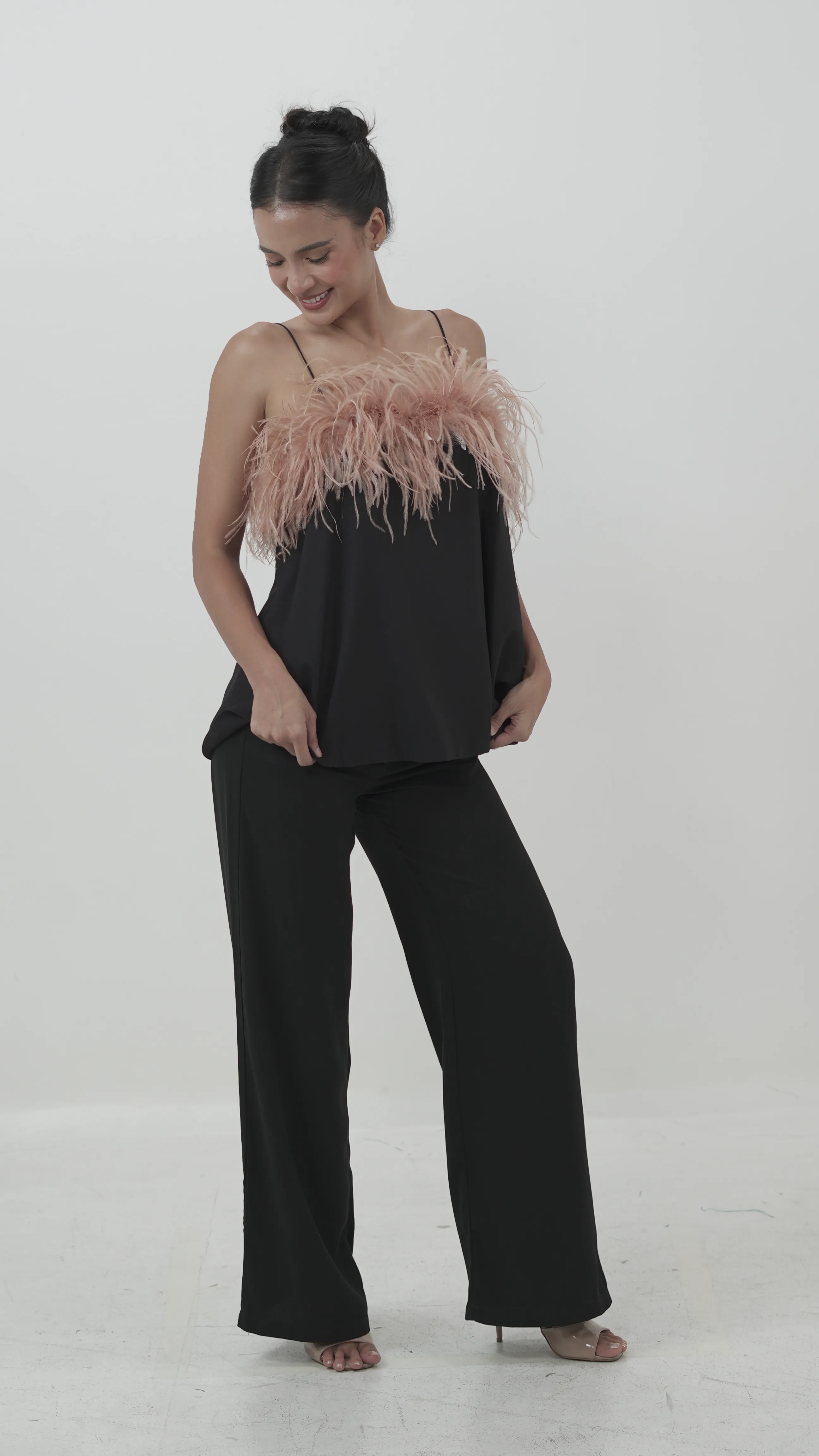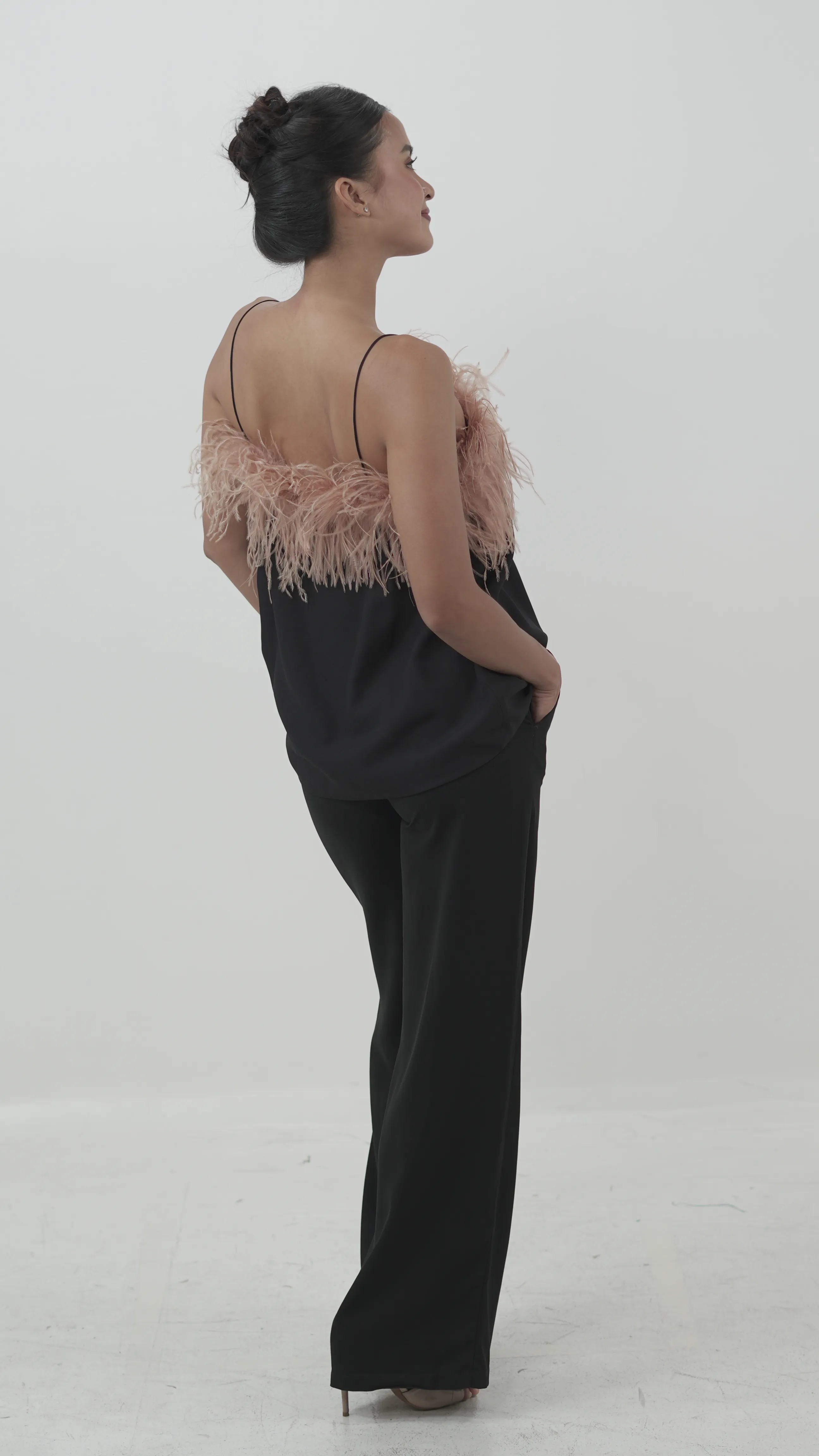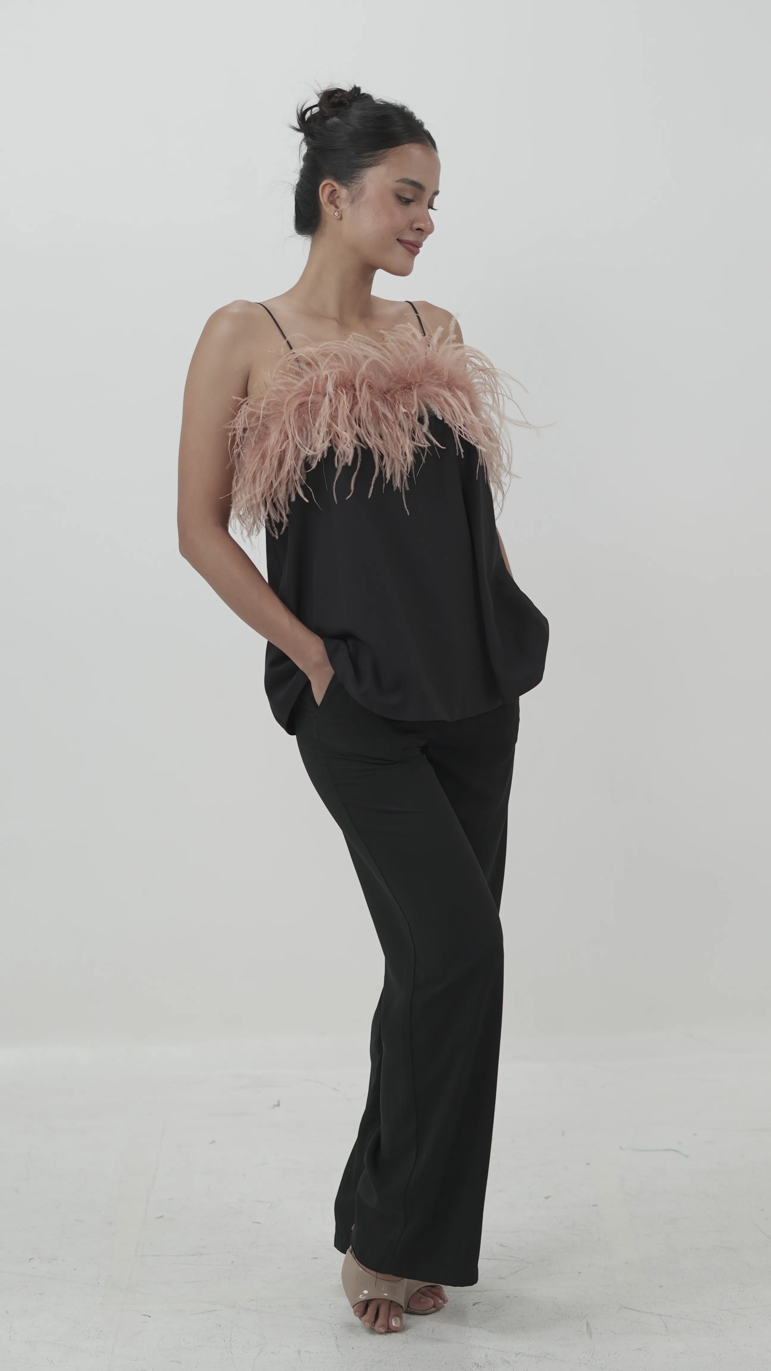 A statement piece featuring soft blush-colored feathers lining the neckline of a flowy black camisole. The relaxed silhouette and delicate straps add a refined touch to the textured embellishment.