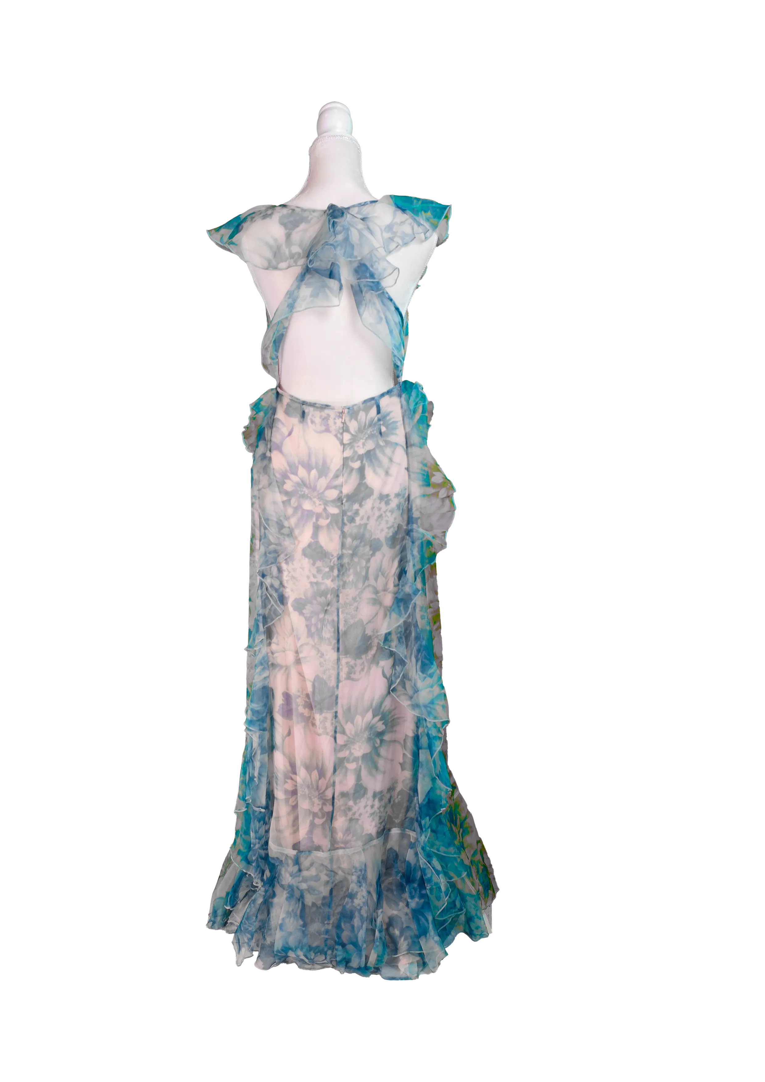 A flowing slip dress with a sheer blue and beige abstract print and delicate thin straps. The airy fabric and subtle layering create a dreamy, ethereal look.