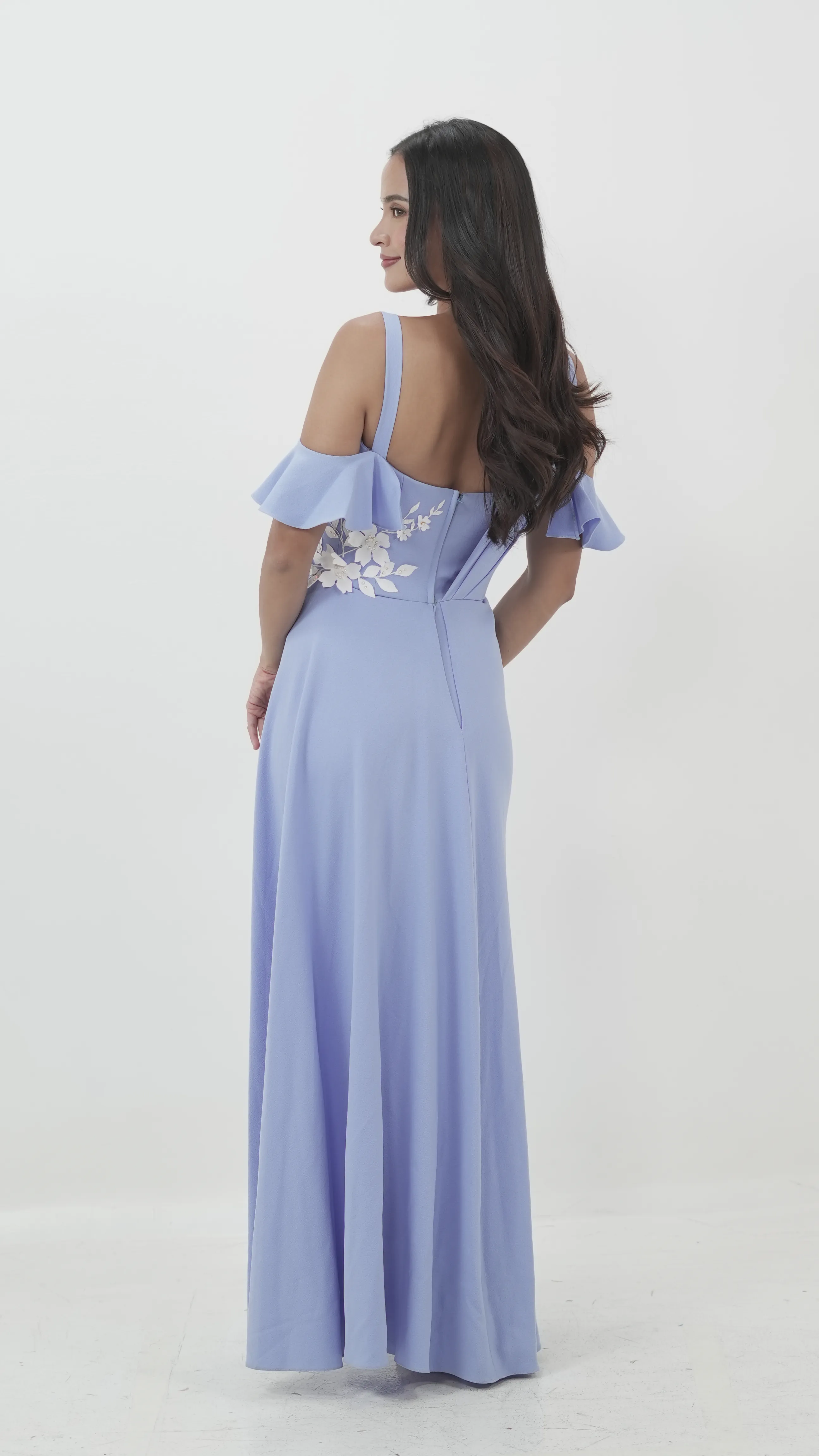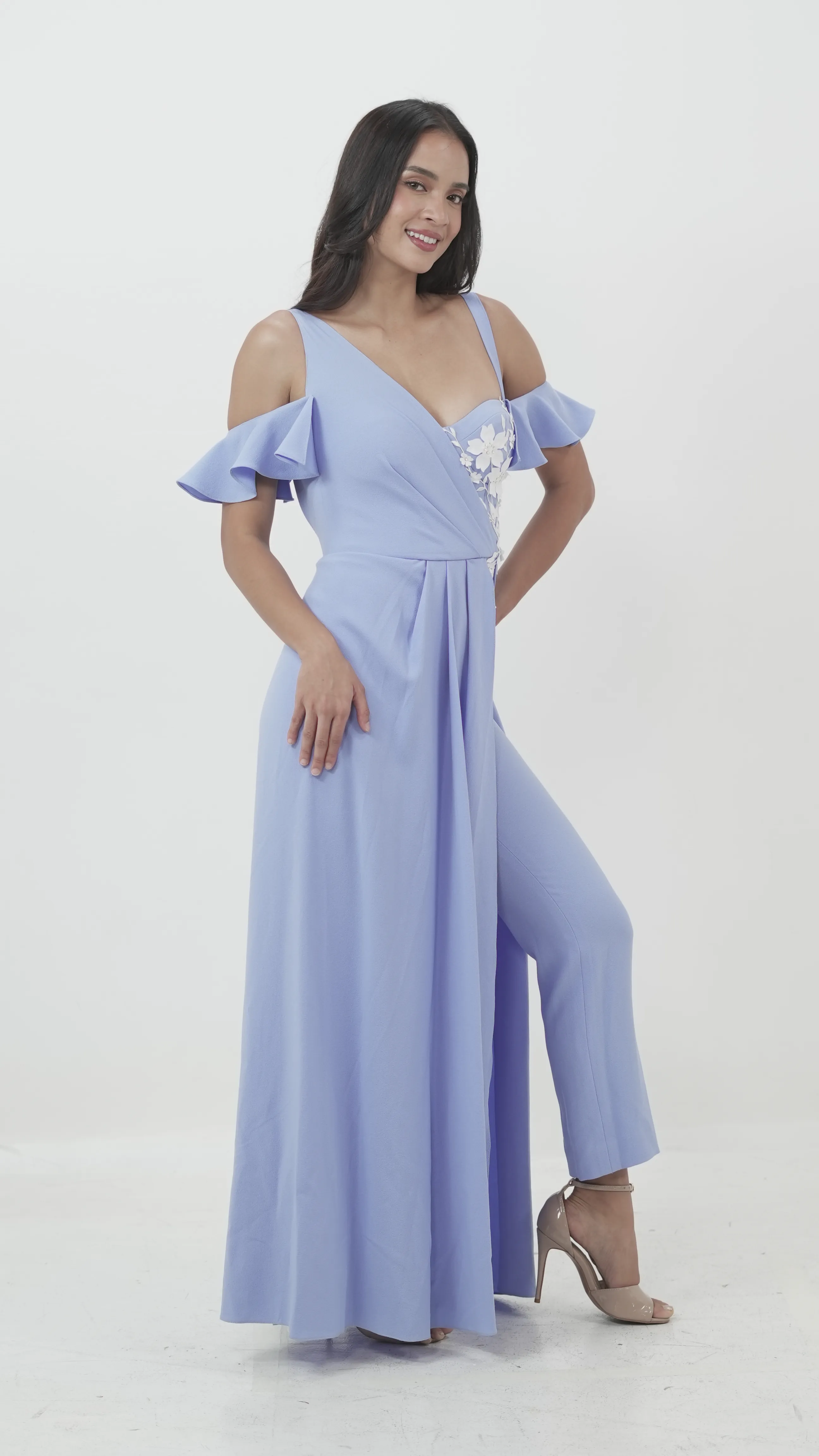 A unique blend of structure and softness, this blue jumpsuit features a flowy overlay skirt, cold-shoulder ruffle sleeves, and delicate white floral embroidery on the bodice. Perfect for those who want comfort and style in one striking piece.