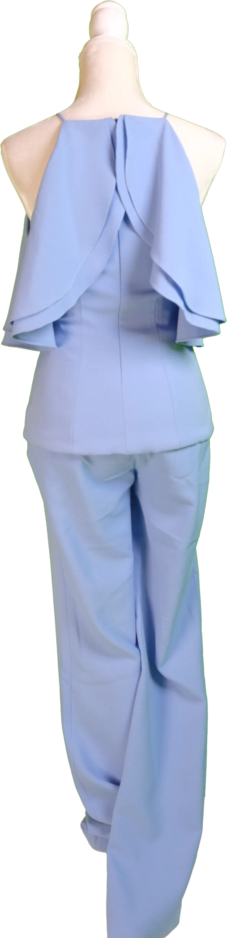 A chic ruffled halter top with matching wide-leg pants in a soft blue hue. The layered ruffle detail brings movement and femininity, while the trousers balance the look with clean lines. Ideal for daytime events or relaxed evening gatherings with a touch of sophistication.