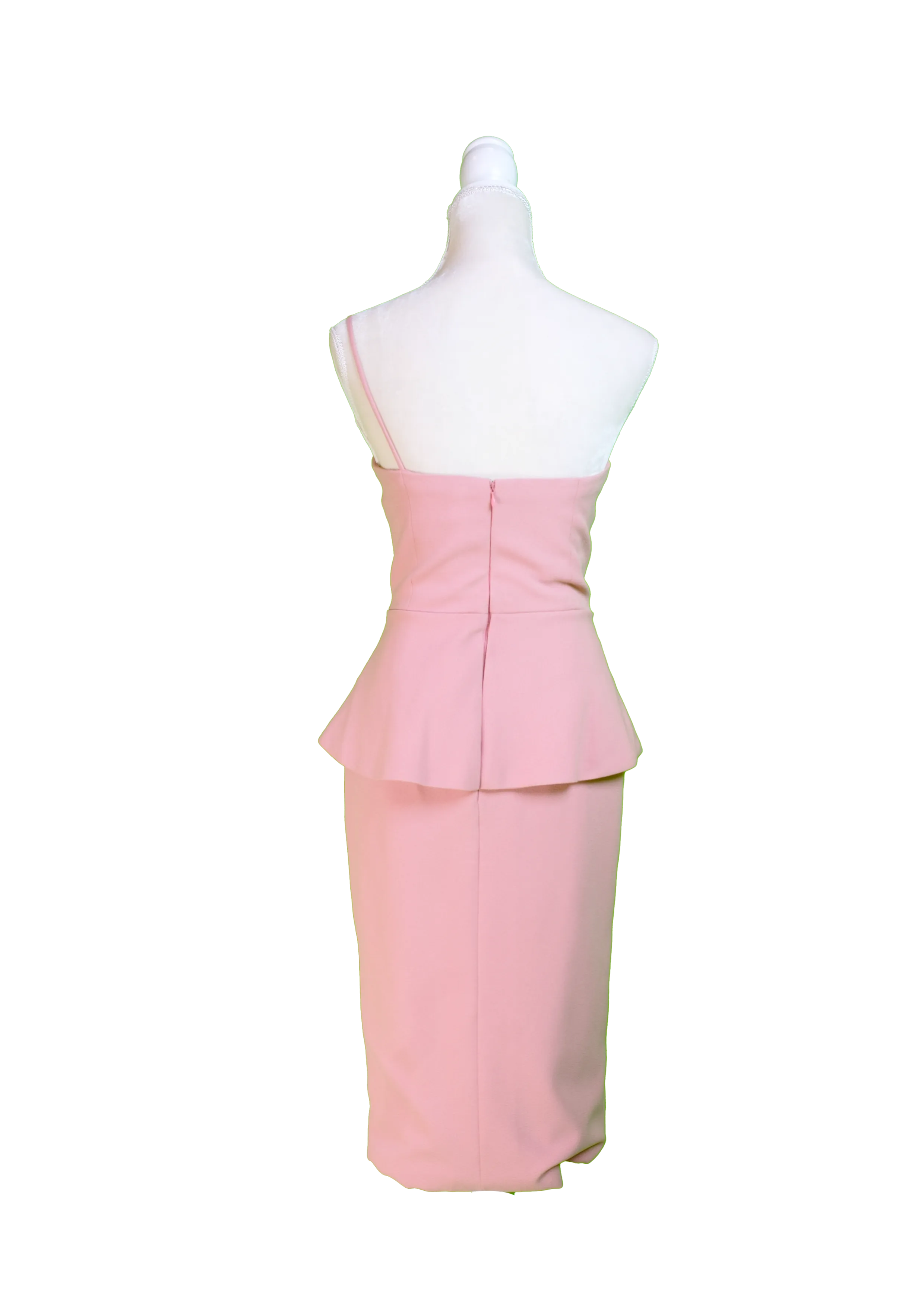 A romantic blush-toned strapless dress with a structured bodice and a soft peplum overlay. The fitted skirt elongates the frame, while the layered waist detail adds a feminine touch.