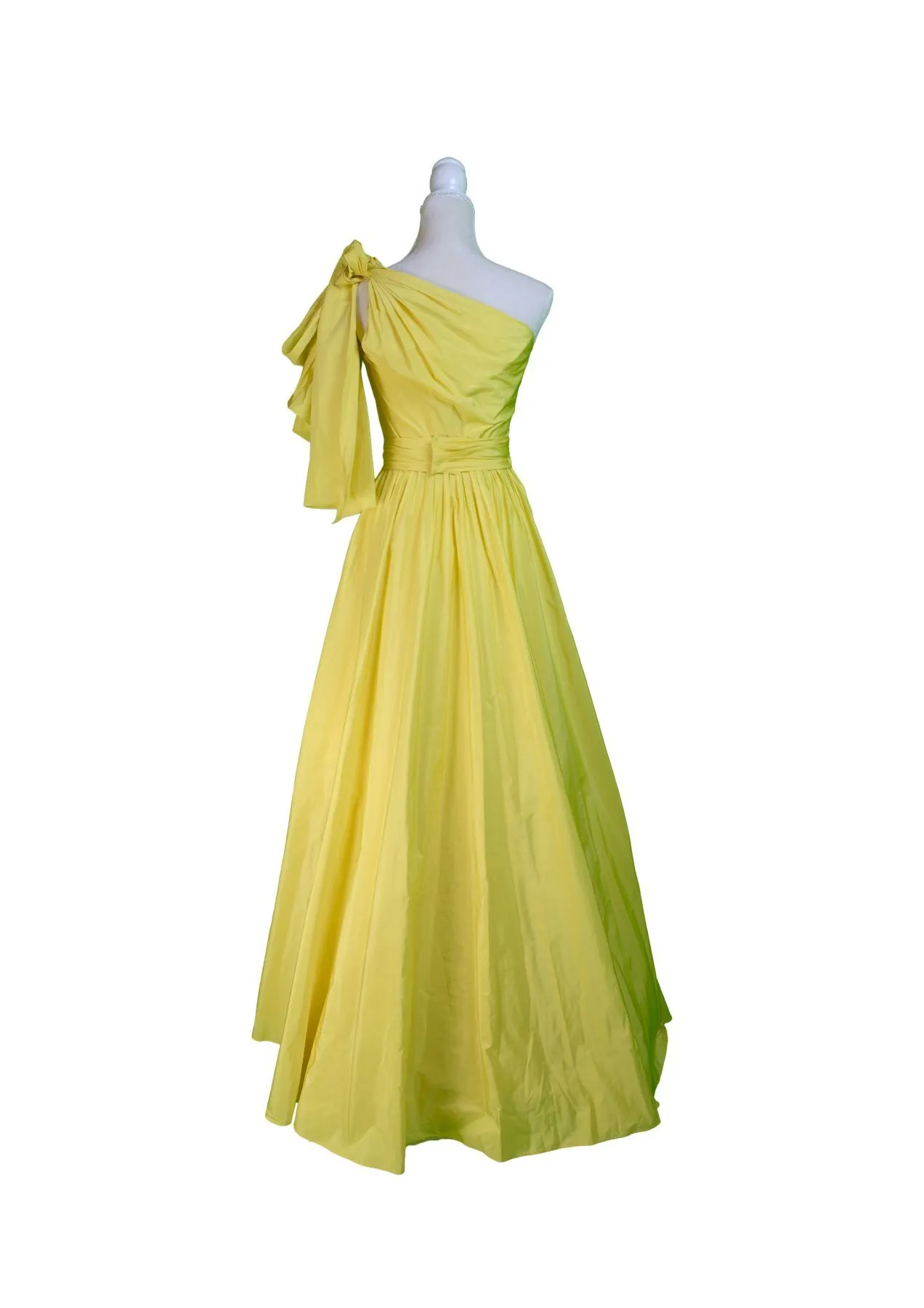 A voluminous bright yellow gown featuring a dramatic one-shoulder neckline with gathered detailing. The full skirt creates a striking presence and a playful yet regal feel.