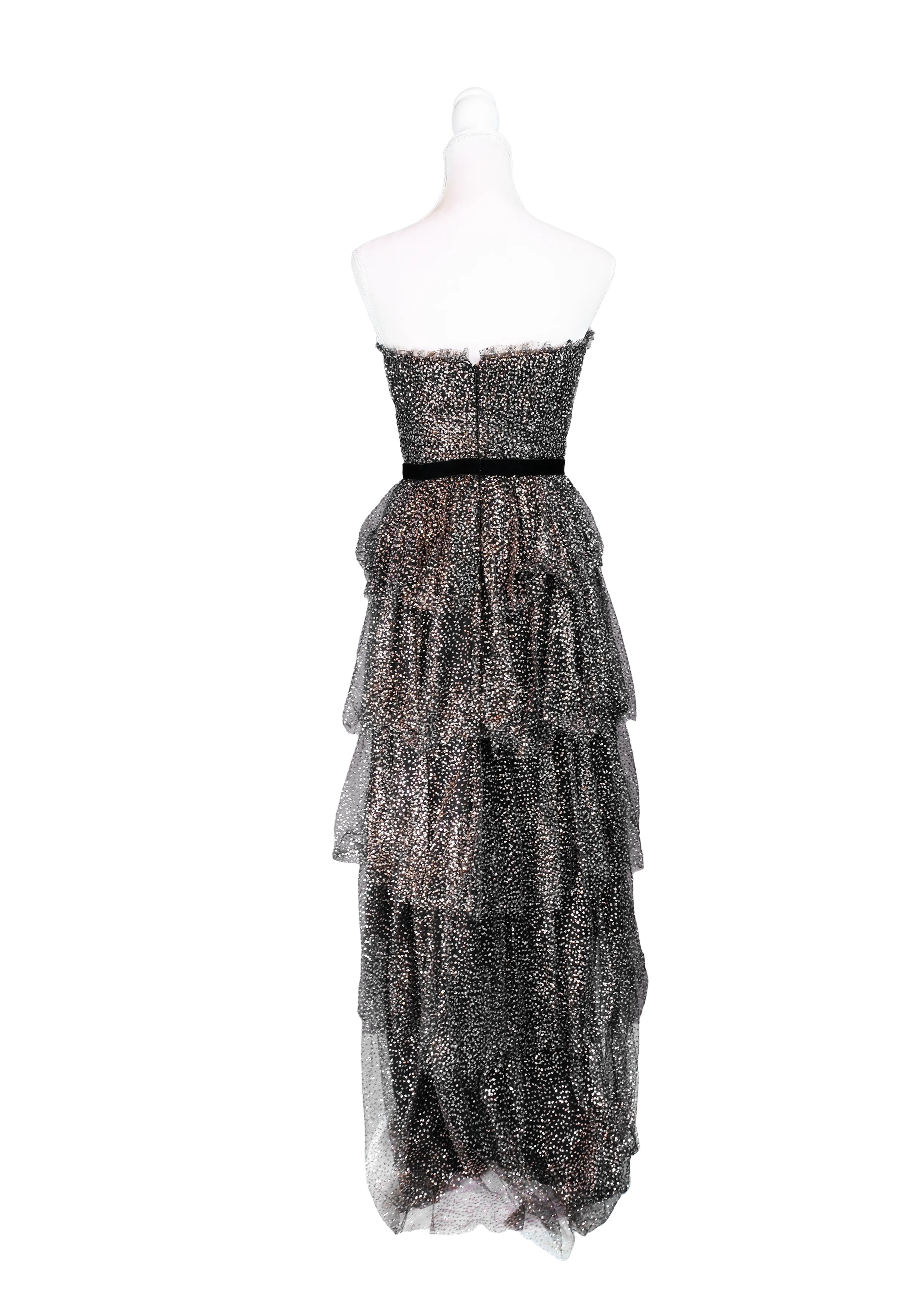 A gown in bronze sequins with tiered layers of fabric creating volume. The strapless
