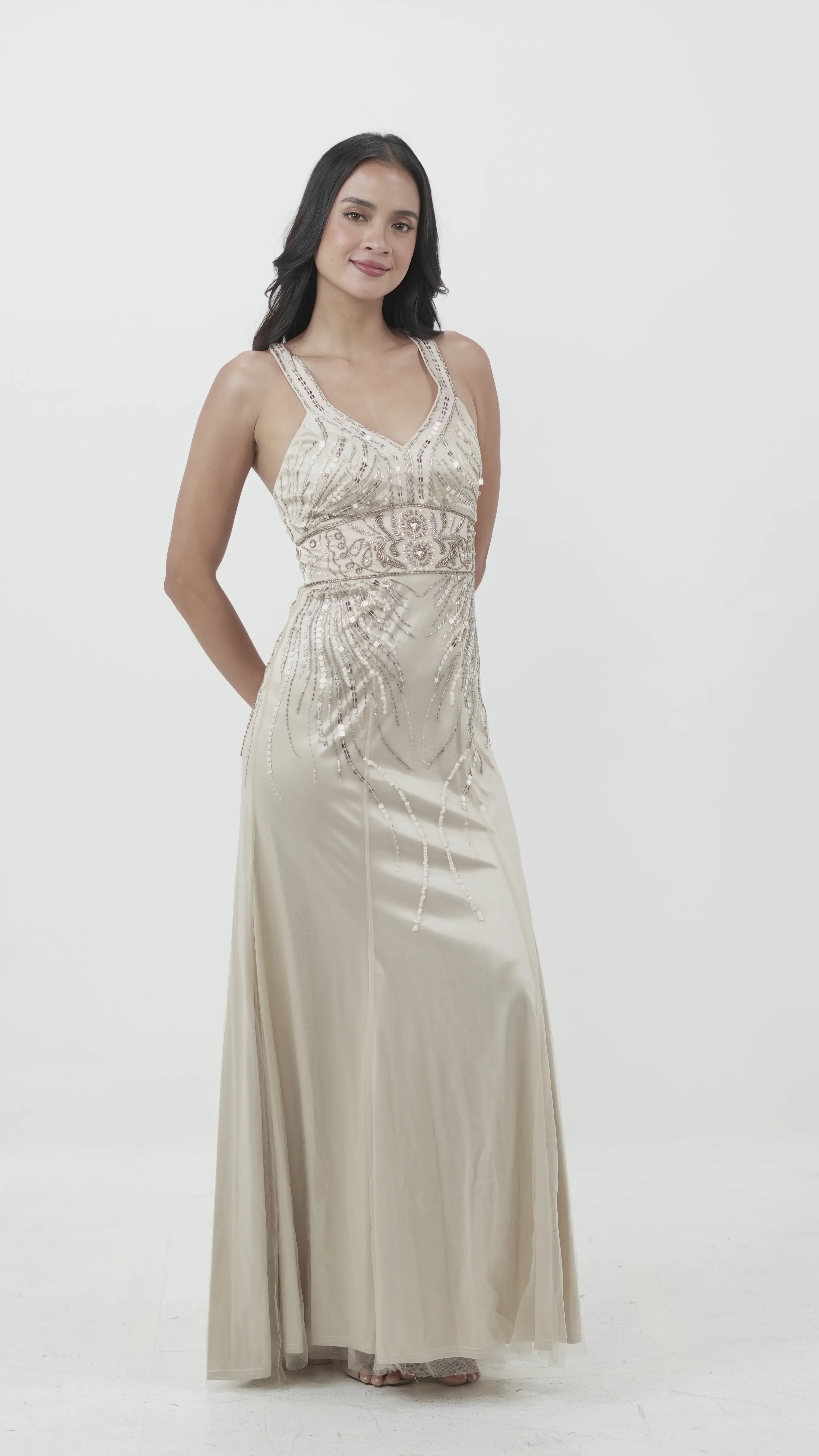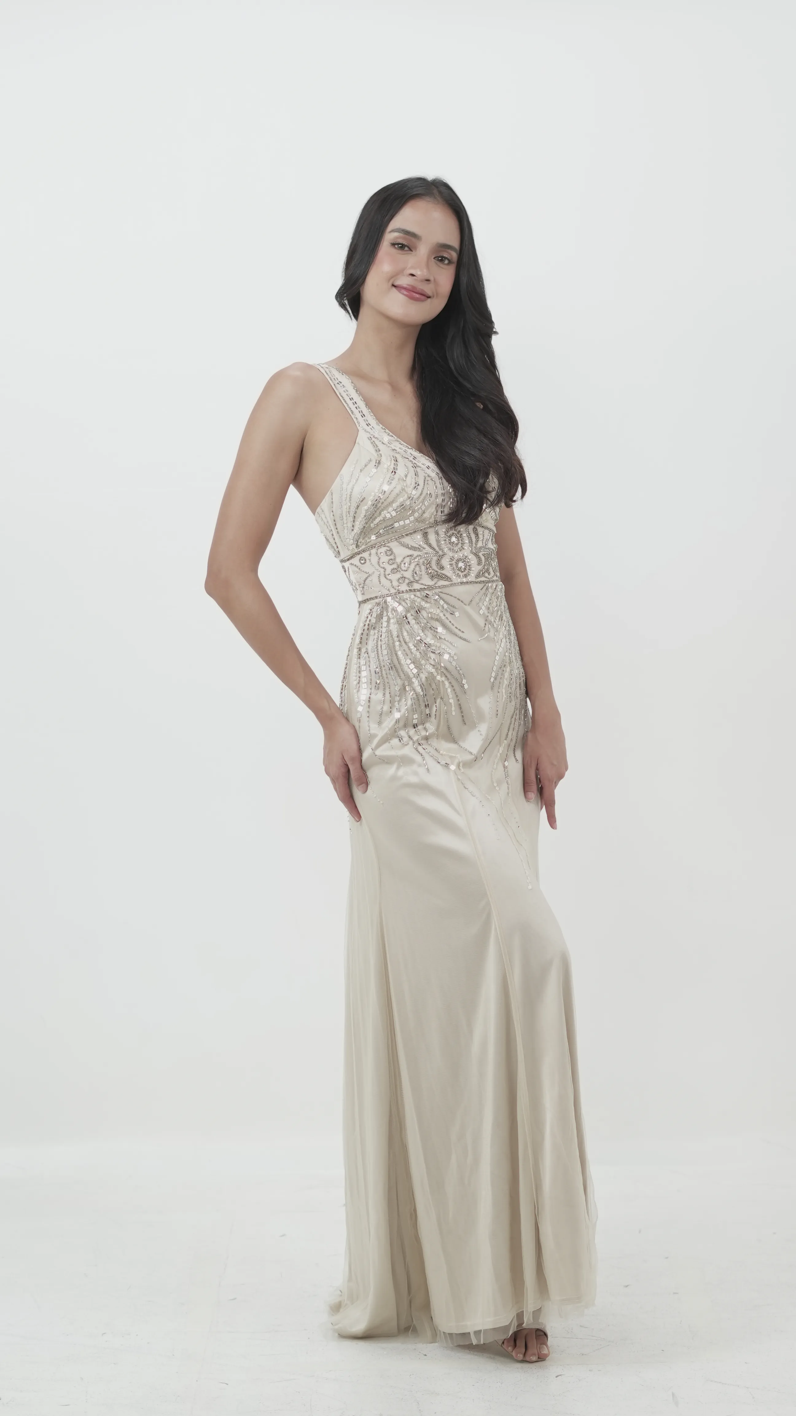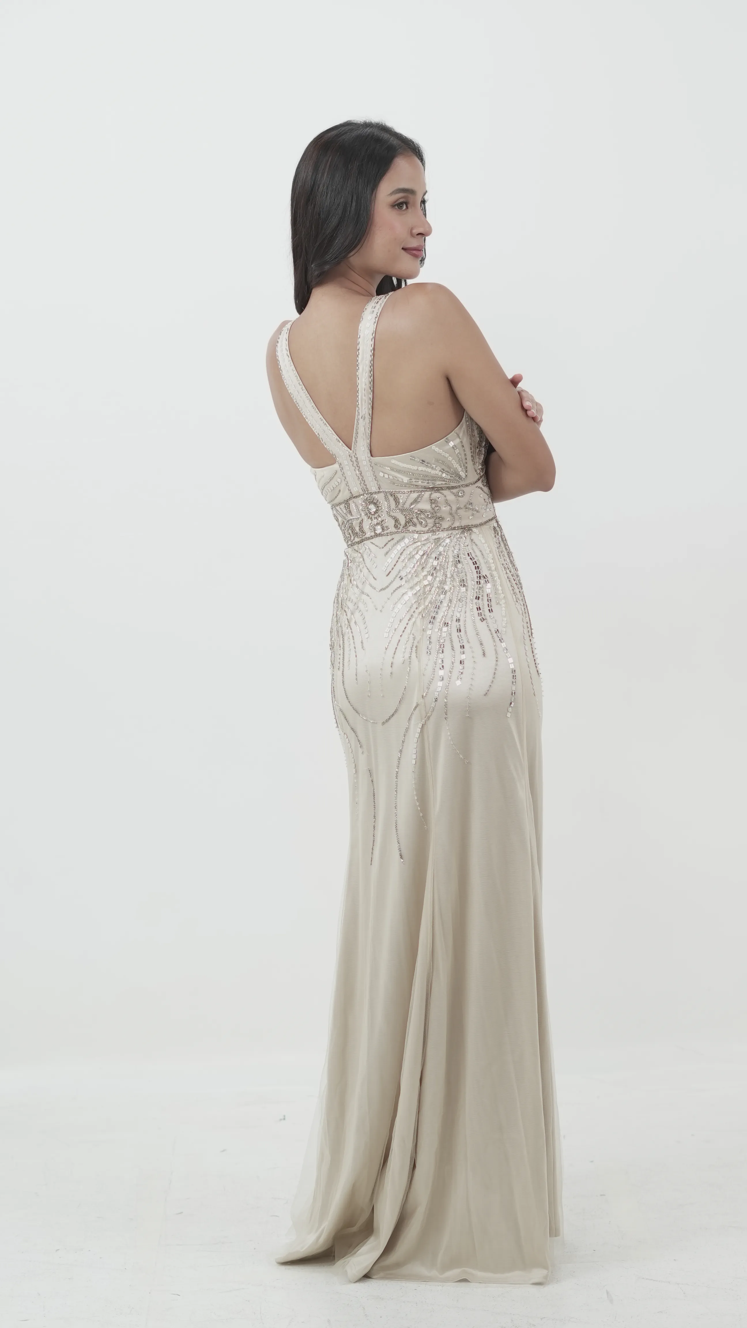 Channel Old Hollywood with this champagne-colored gown featuring intricate art deco beading. The flattering V-neckline and soft, flowing fit give it a classic and sophisticated appeal.BRAND: SUE WONGFITS: S / SIZE 2