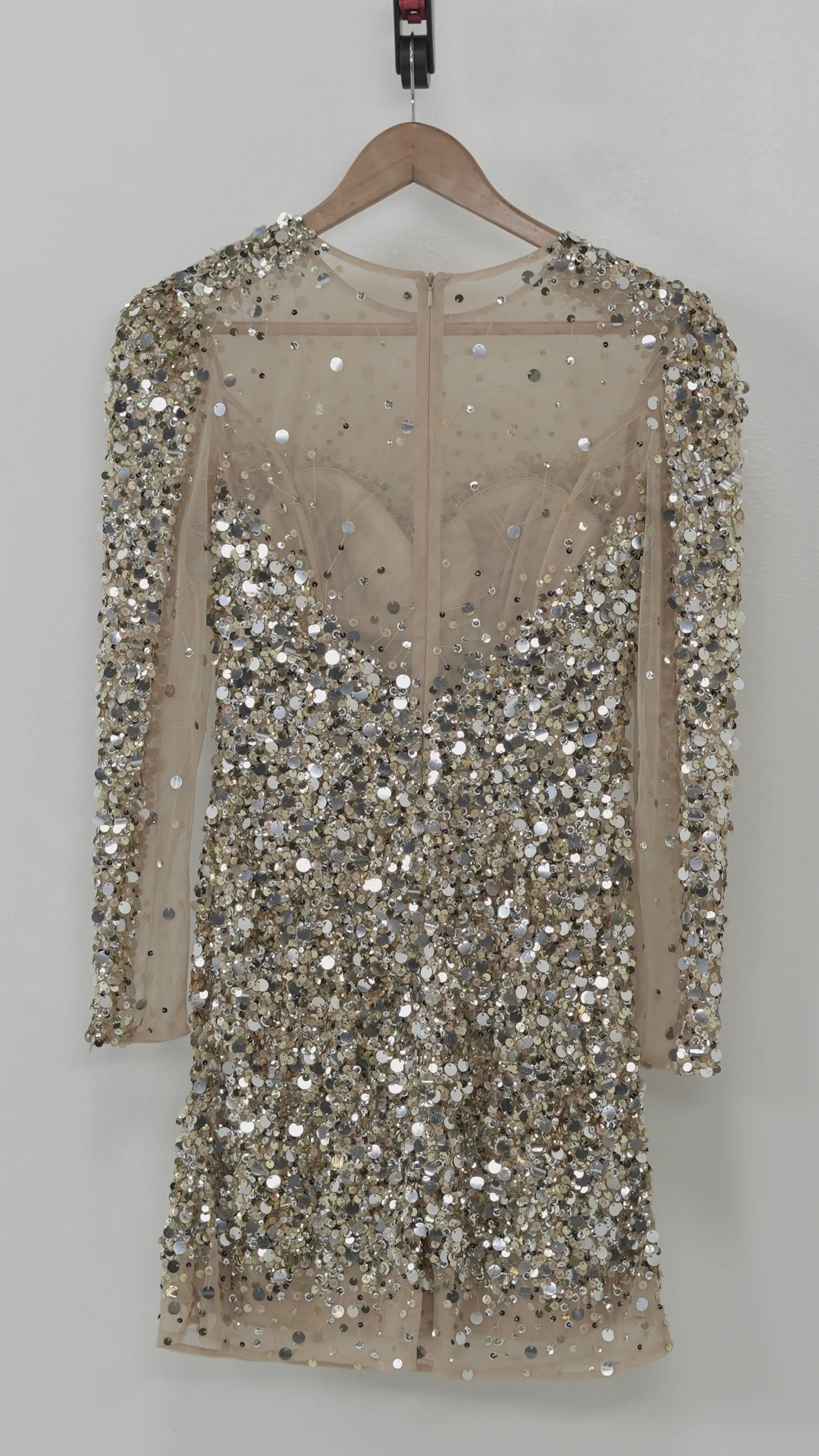 A nude mesh mini dress fully embellished with silver and gold sequins. The sheer neckline and long sleeves add a sleek contrast to the body-hugging silhouette, creating a striking balance of sparkle and sophistication.