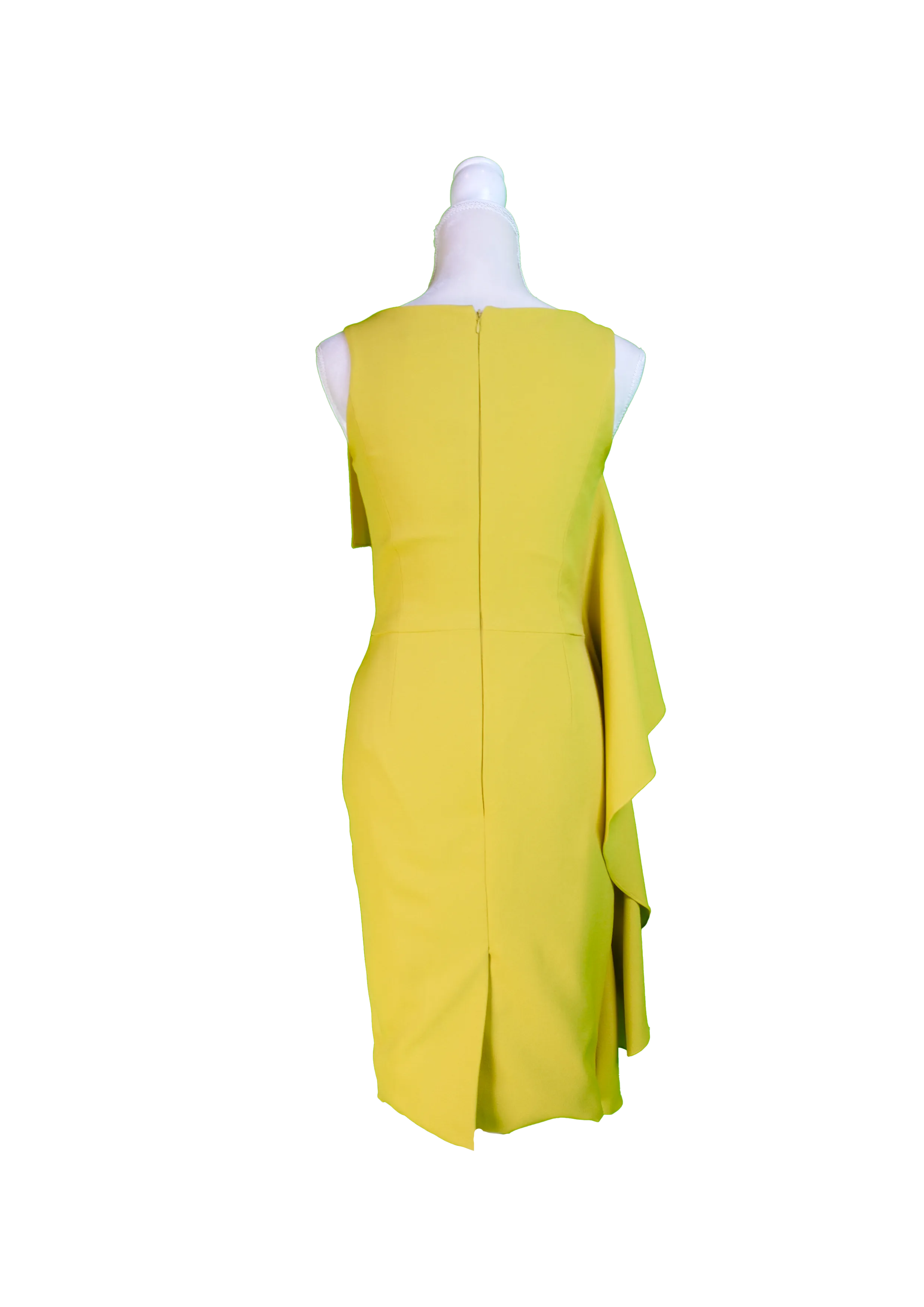 A bold chartreuse sheath dress featuring a layered one-shoulder drape that cascades down the side. The vibrant hue and clean silhouette create a modern statement piece.