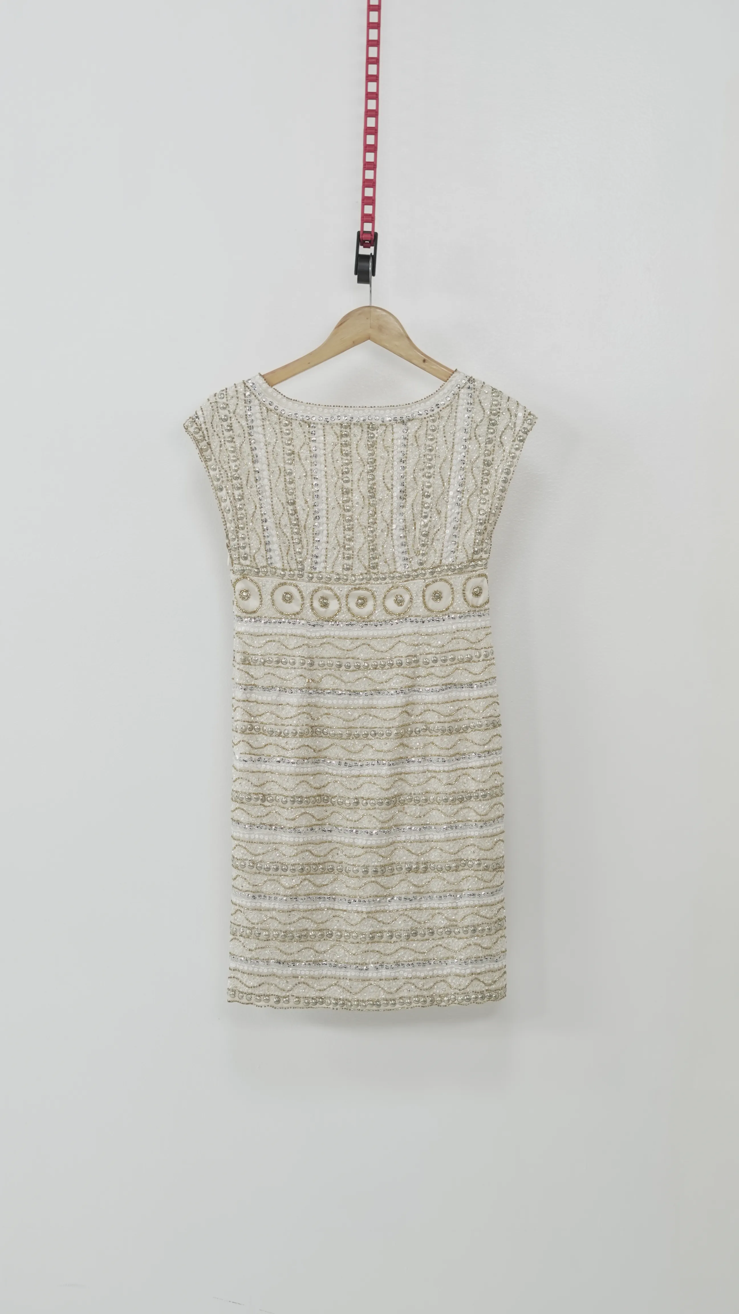 Channel vintage elegance in this intricately beaded ivory mini dress. The V-neckline and symmetrical art deco pattern give it a timeless, show-stopping flair.