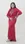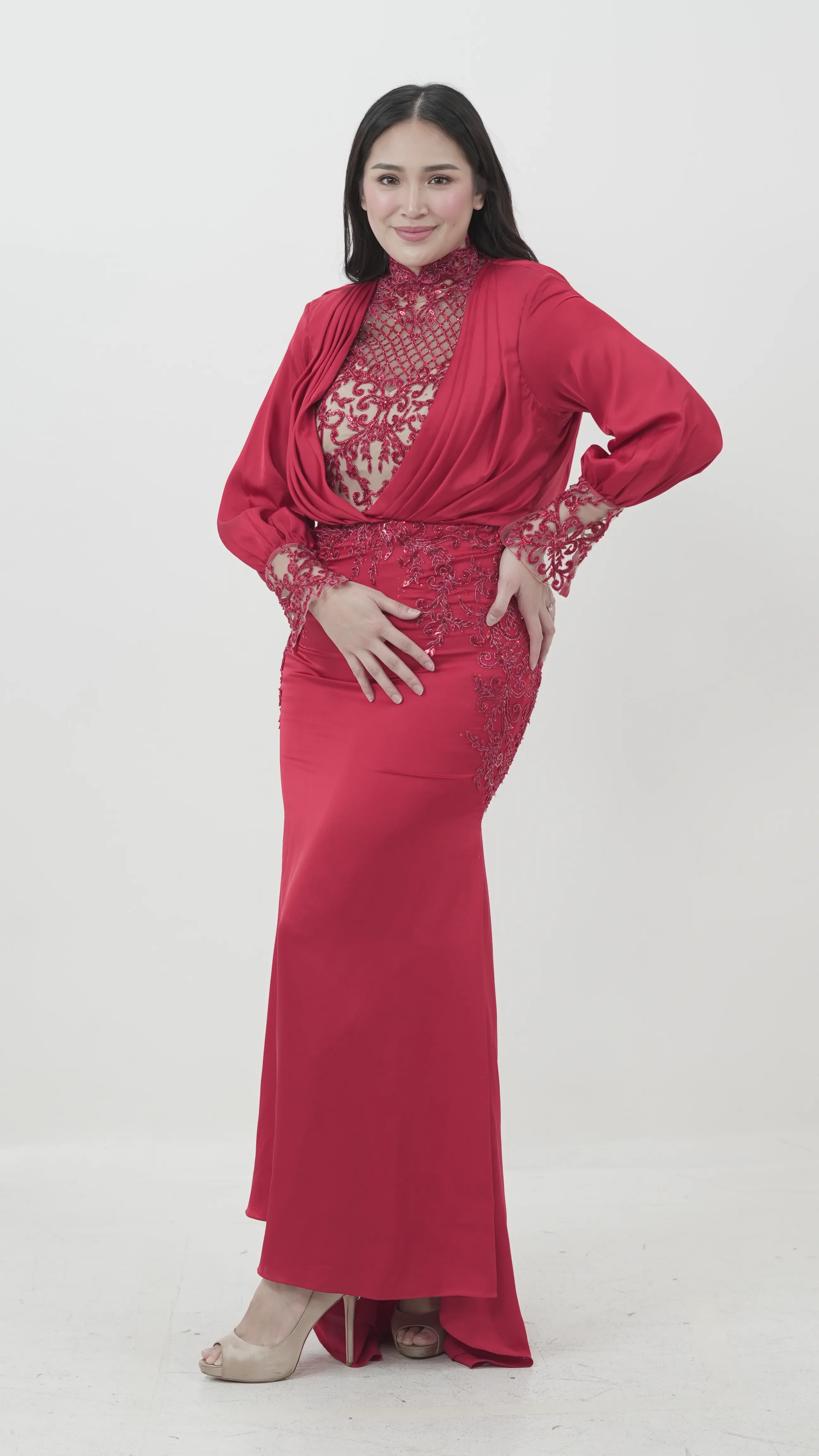 This sultry crimson gown features a high neckline, sheer illusion bodice with intricate lace embroidery, and flowing sleeves. A seductive and regal choice for formal events.