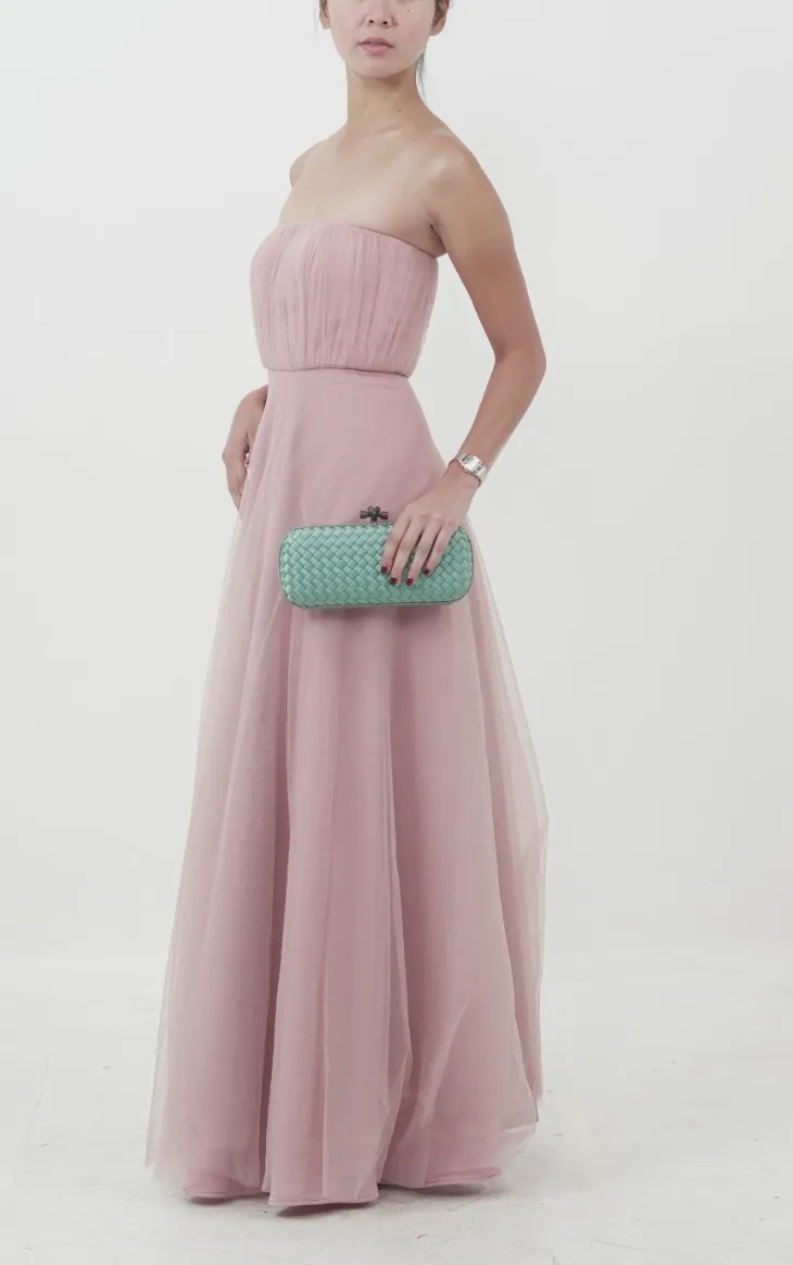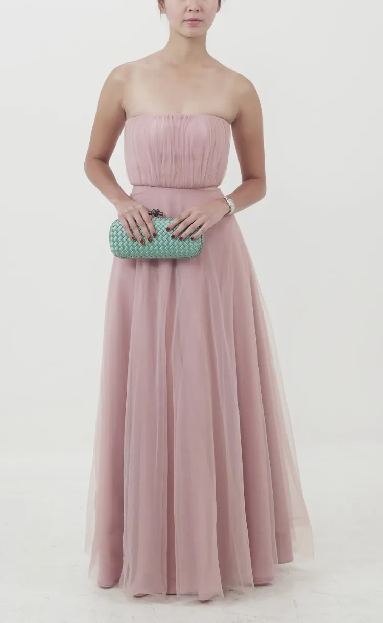 A soft and romantic full-length gown in dusty pink tulle. Features a strapless ruched bodice and a flowing A-line silhouette. Timeless and graceful—great for bridesmaids, weddings, or debuts.