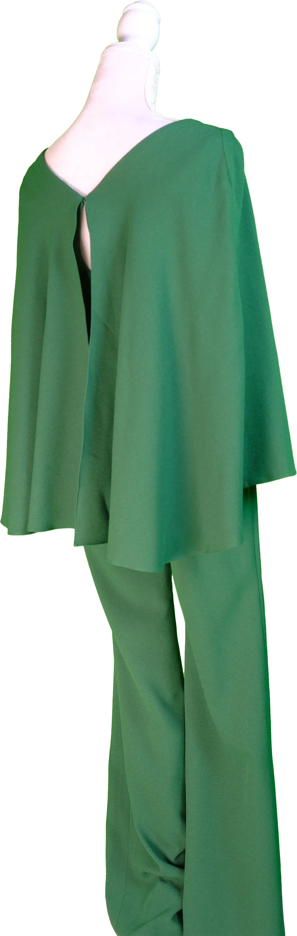 An emerald green jumpsuit with a flattering V-neckline and cape-style sleeves. The wide-leg cut adds fluidity, while the vivid hue makes it stand out effortlessly.