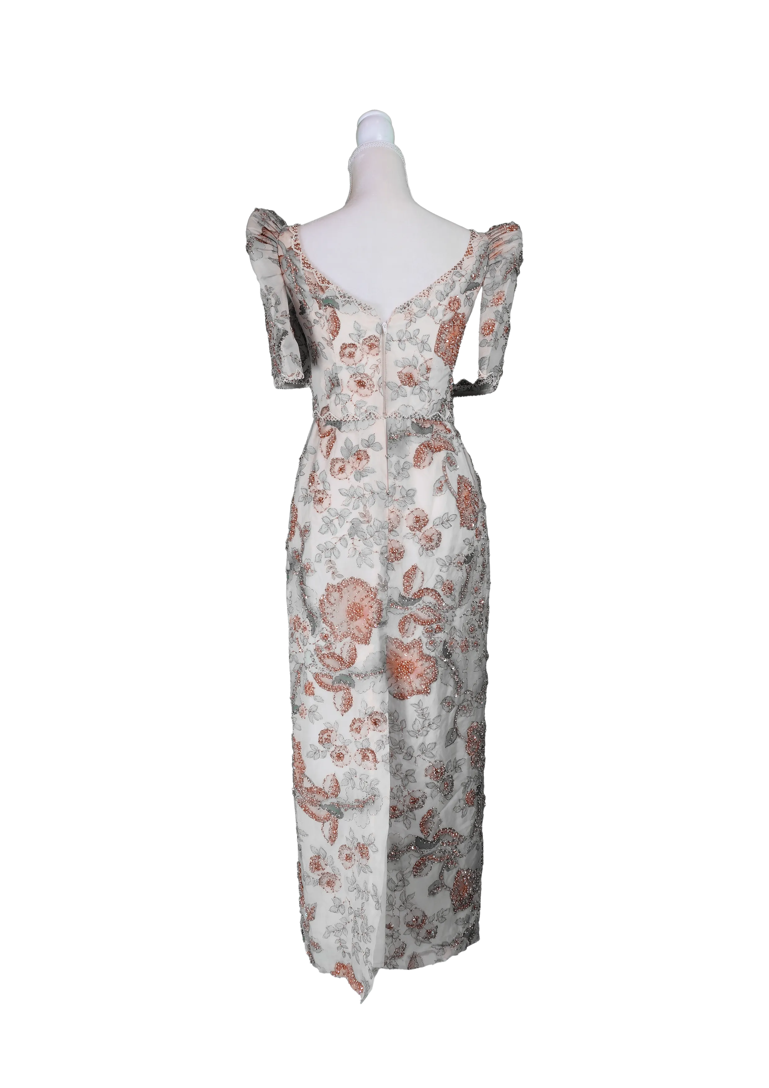 A long fitted gown in muted floral jacquard Filipiniana with a straight neckline. Its tailored column