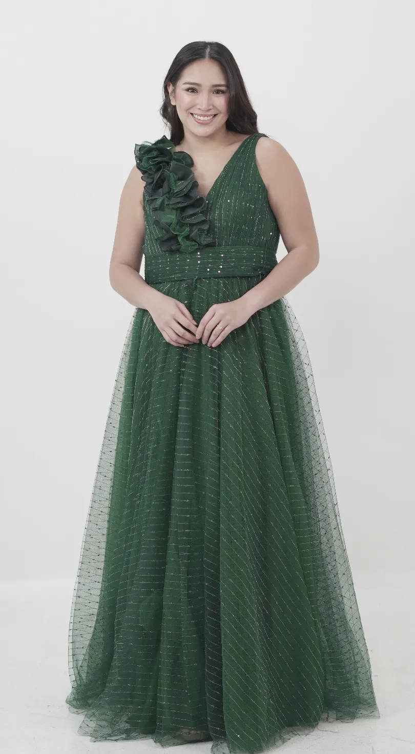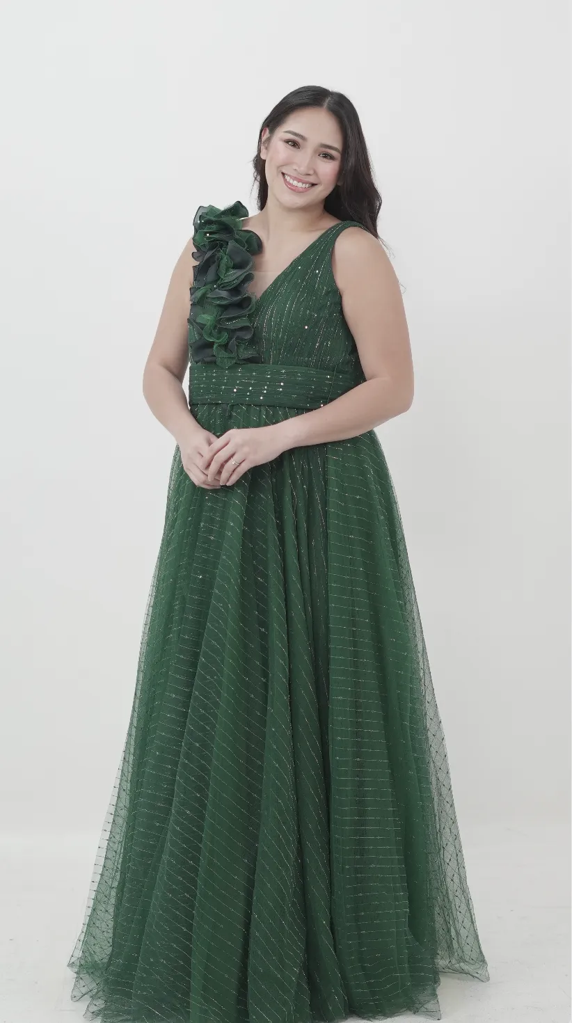 A deep green tulle gown with gold thread accents and an asymmetrical ruffled shoulder detail. The layered skirt and waistband create a flattering shape. Suitable for formal events or glam evening wear.