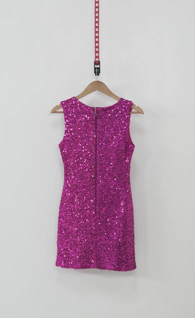 Fierce and flirty, this sleeveless hot pink mini dress features a shimmering sequin finish and a stylish side cutout.