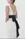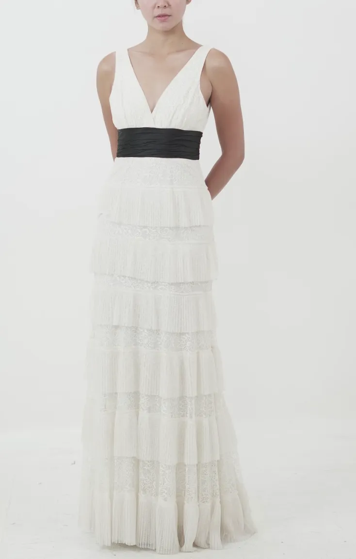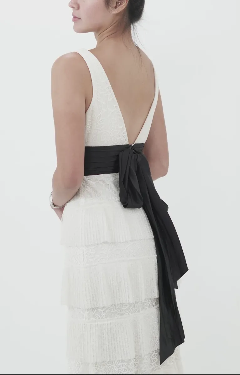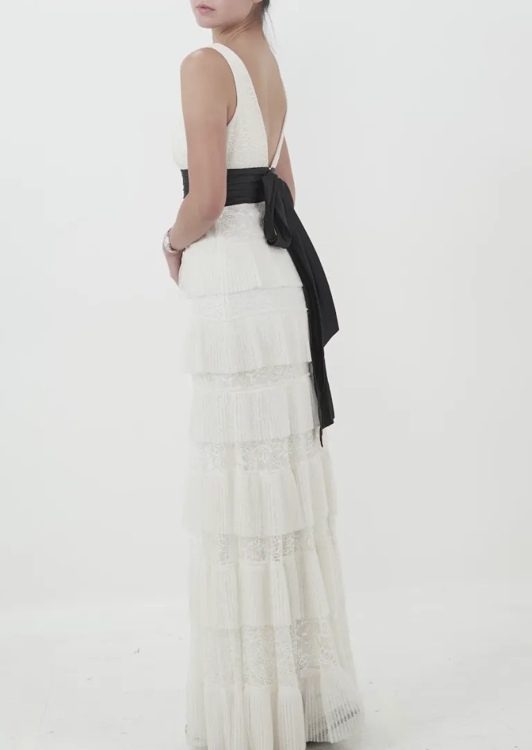 An elegant sleeveless gown featuring layers of lace and pleated tulle in a soft ivory tone. The deep V neckline and contrasting wide black waistband with a bow at the back add a striking modern touch. Perfect for formal events or black-and-white themed parties.