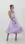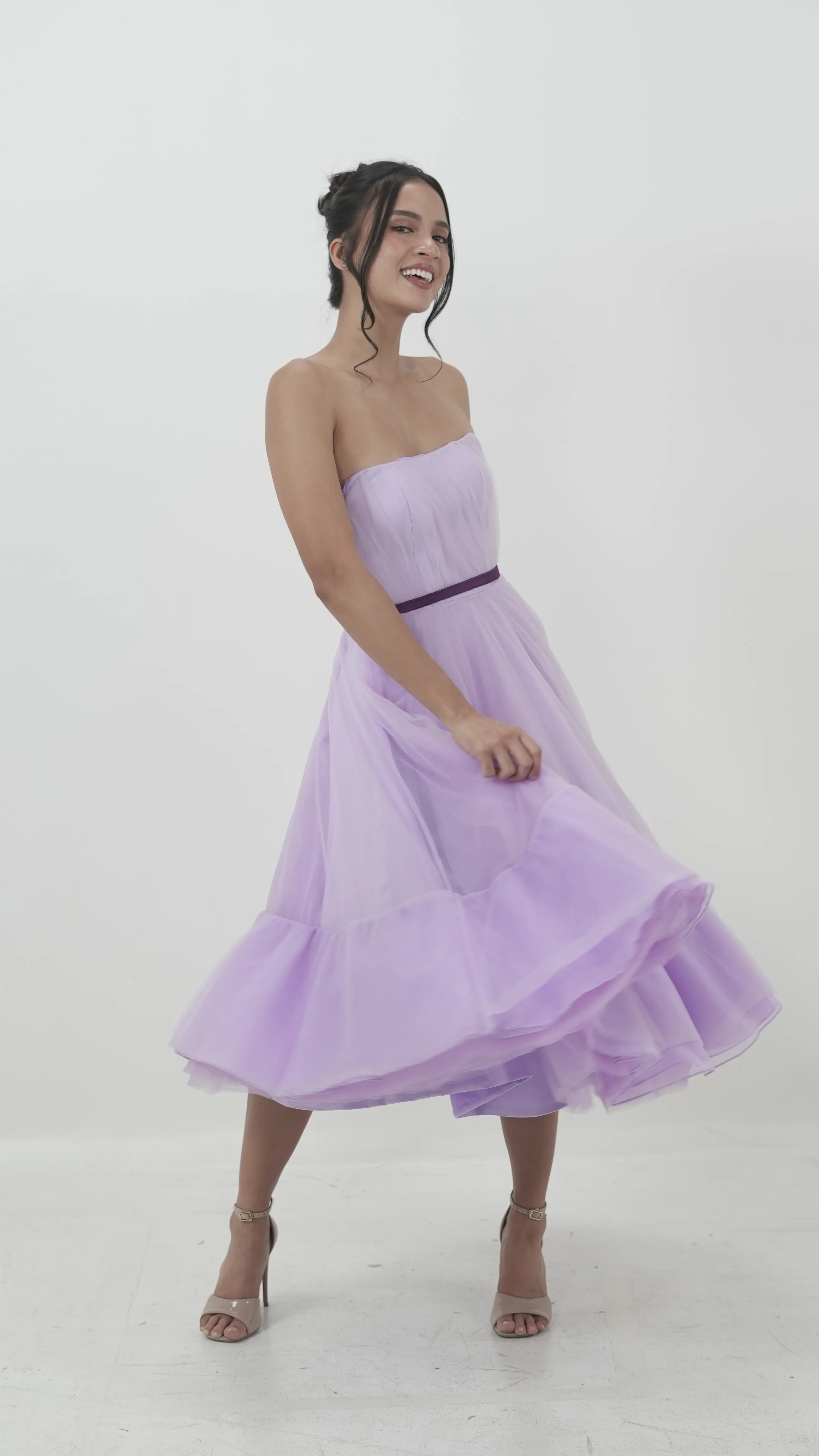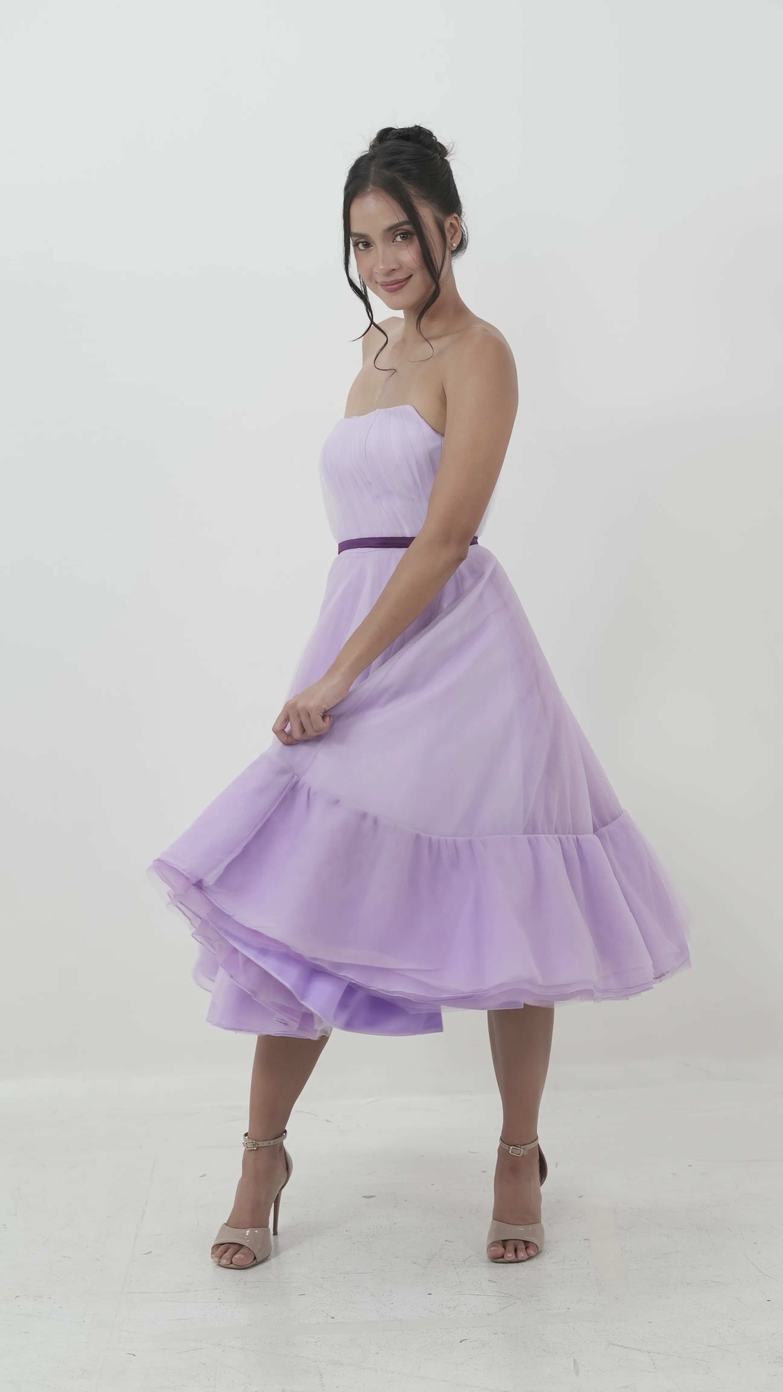 Soft pleats and a full skirt define this strapless lilac tea-length dress. The deep plum velvet waistband adds contrast and shape to the dreamy tulle silhouette.
