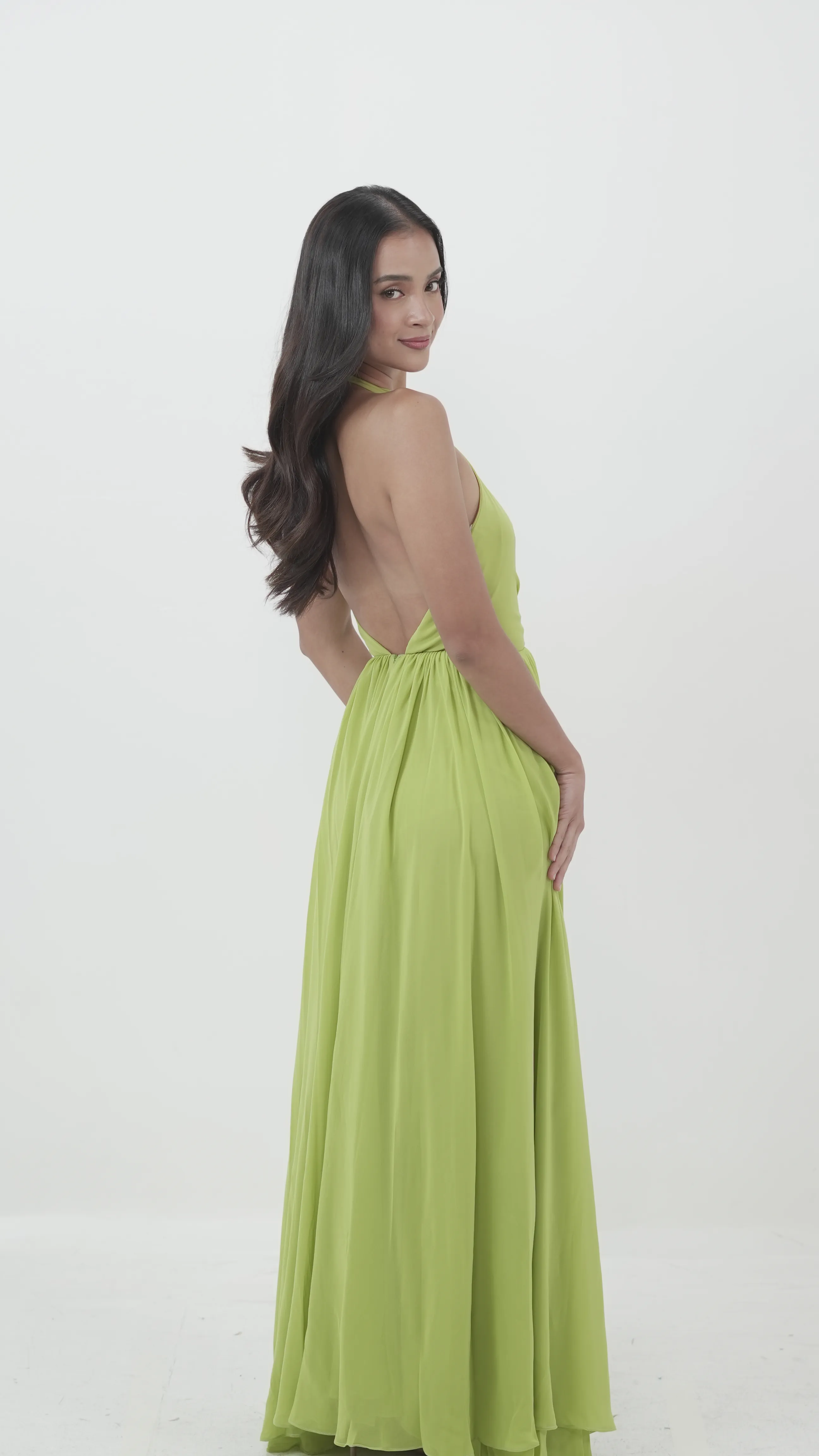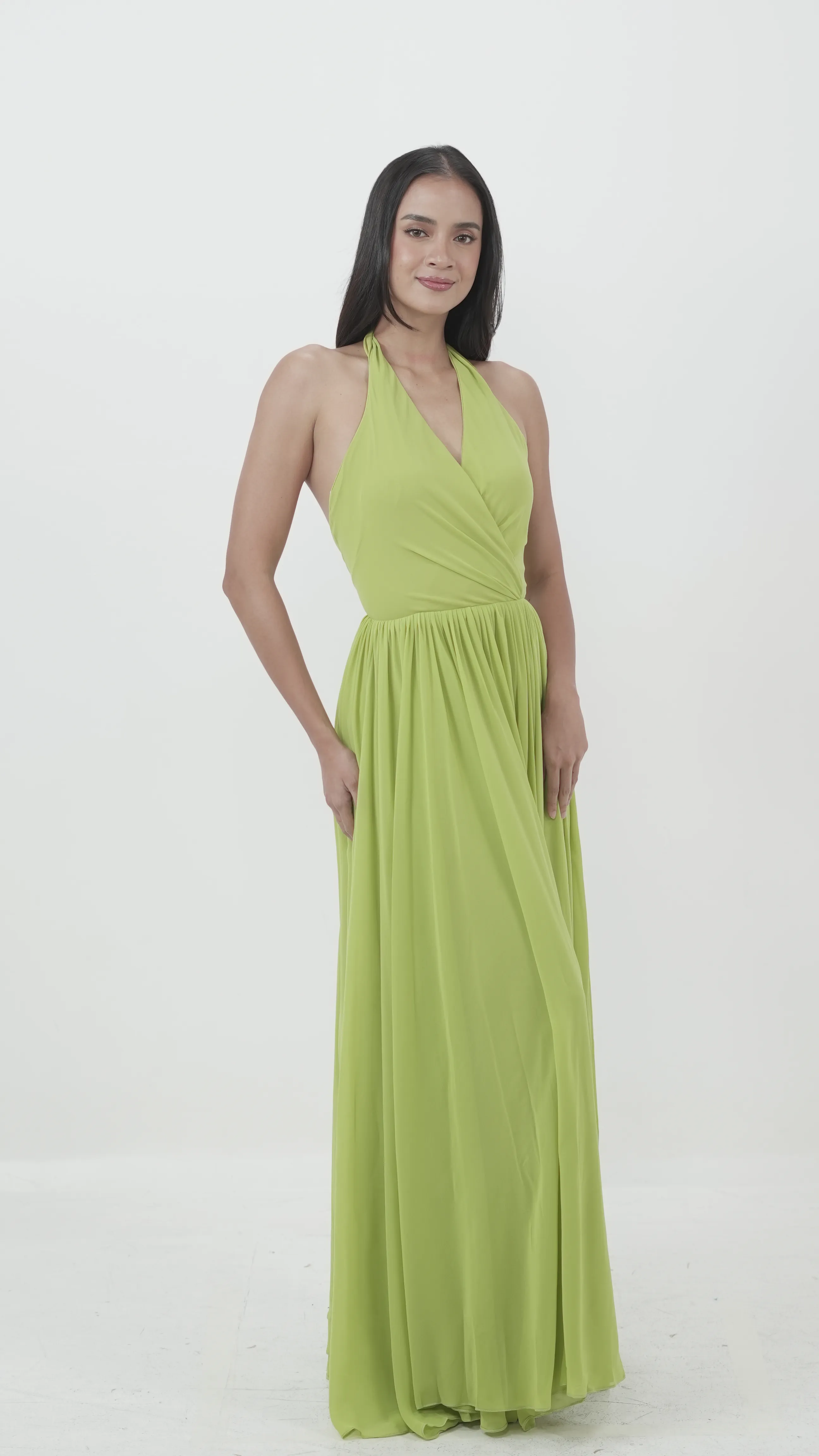 This vibrant lime green halter gown is crafted from lightweight, flowing chiffon for graceful movement. It features a flattering wrap-style bodice, deep V neckline, and gathered waistband for an effortlessly elegant look. Ideal for beach weddings, garden parties, or summer formal events.