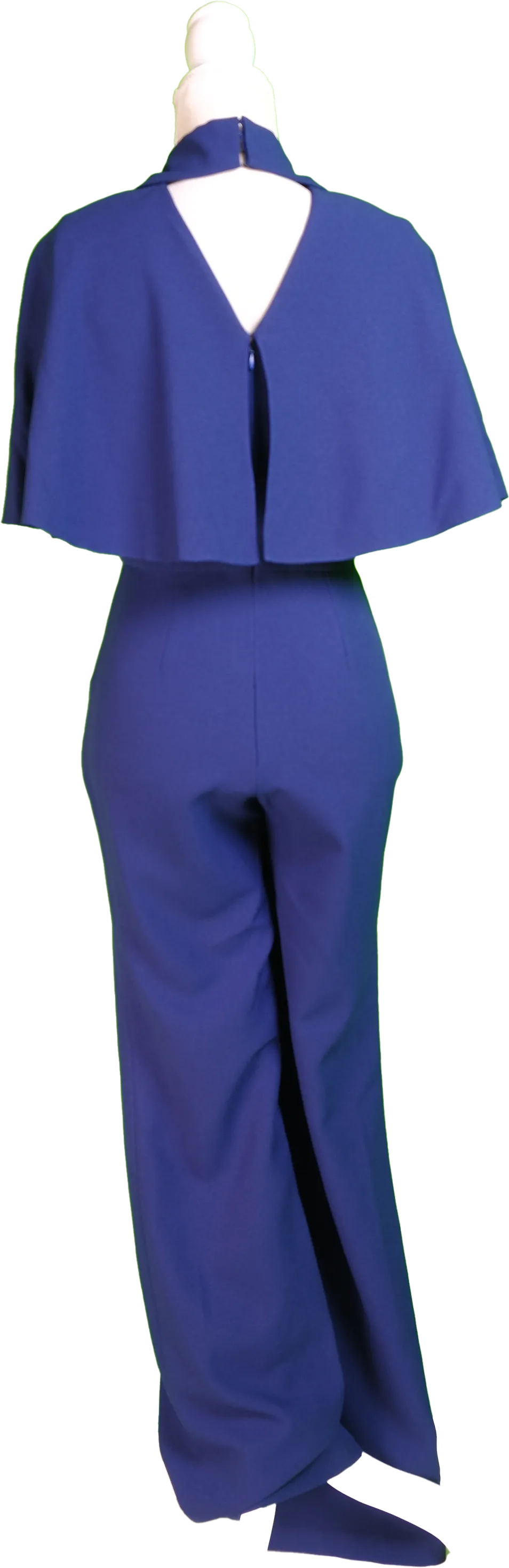A sleek navy jumpsuit that combines minimalist tailoring with a dramatic cape overlay.