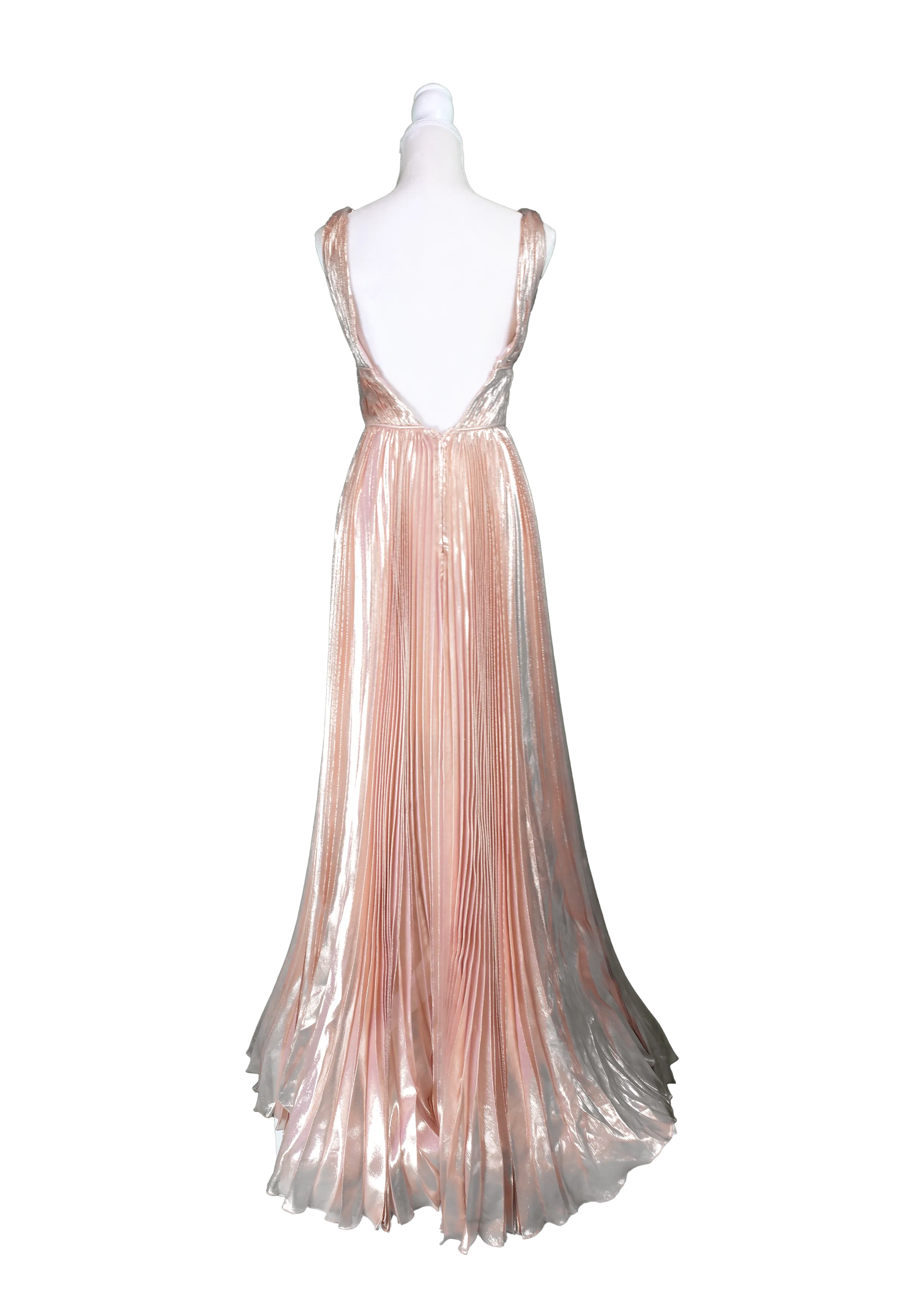 A metallic gold gown with a deep V neckline and knife-pleated skirt that flows beautifully with movement. The liquid-like shine gives it a luxurious, high-impact appeal.