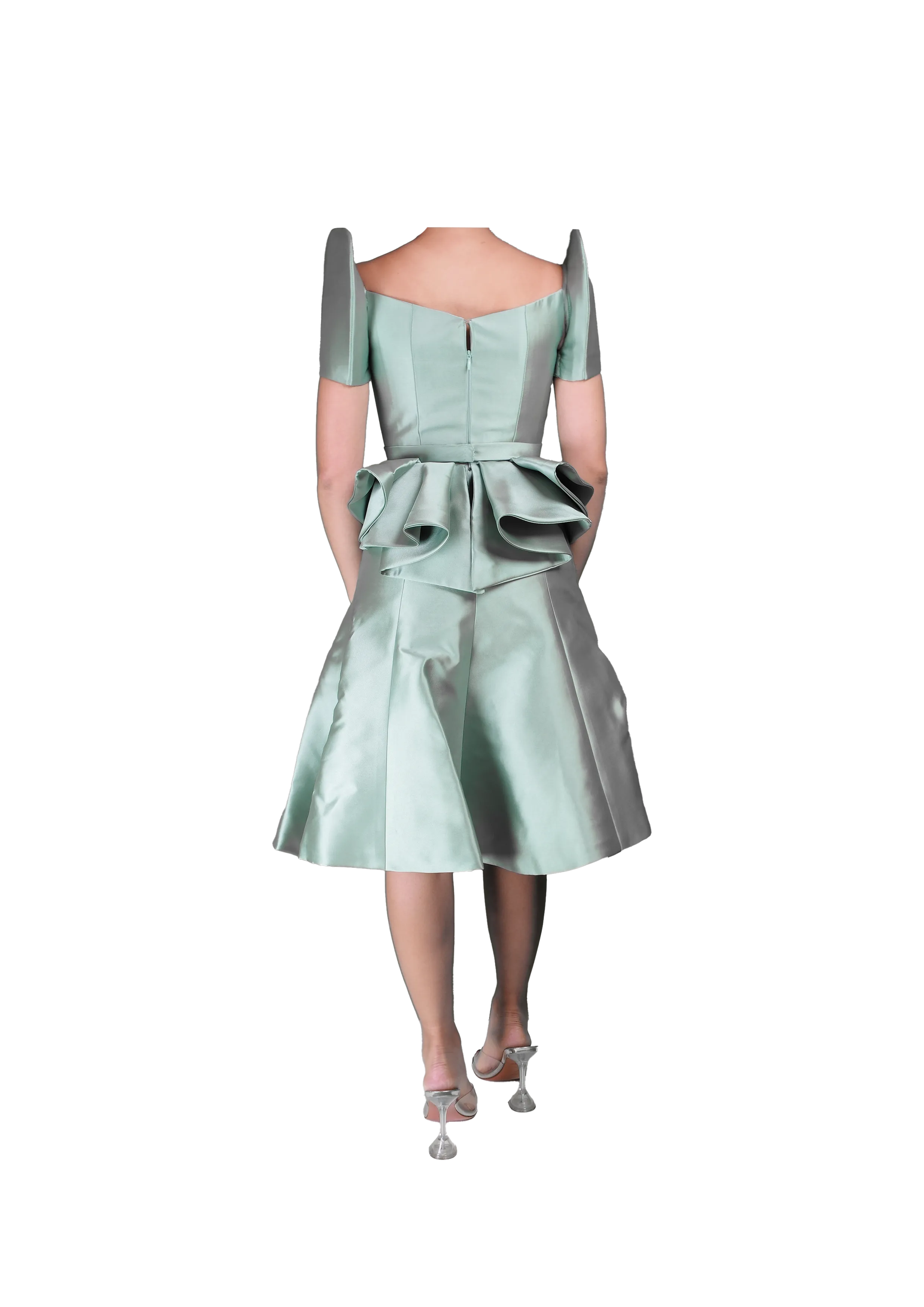 A structured mint green dress with a fitted bodice and wide, angular shoulder details that