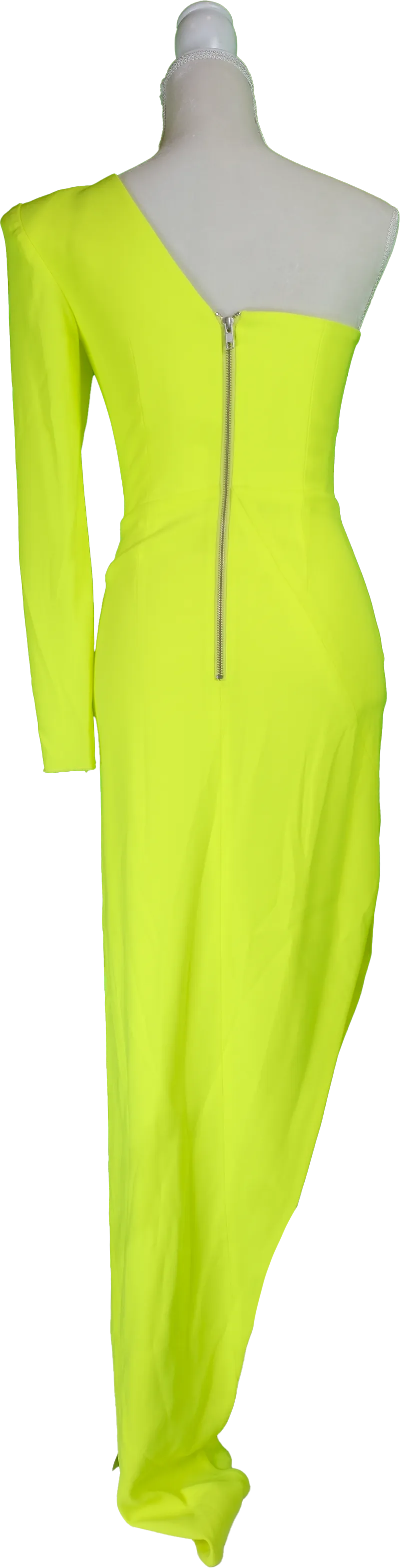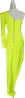 A daring neon green floor-length gown with a single long sleeve and sleek, body-skimming silhouette. The vibrant color and asymmetric cut make it an unmistakable statement piece.