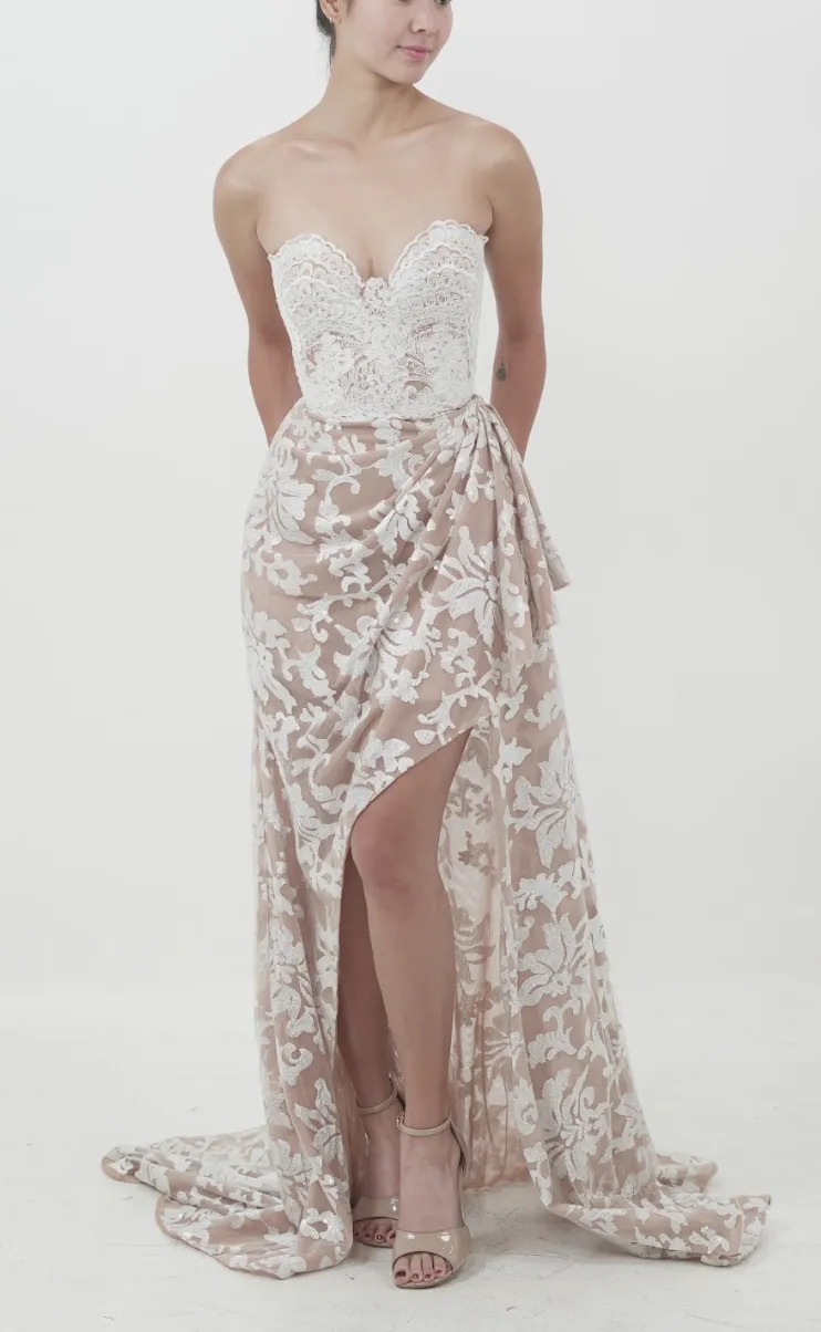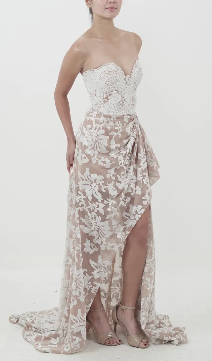 This feminine lace gown features a nude underlay with ivory embroidery, a sweetheart neckline, and a flattering draped skirt with a front slit. Soft, sexy, and sophisticated—perfect for special occasions or receptions.