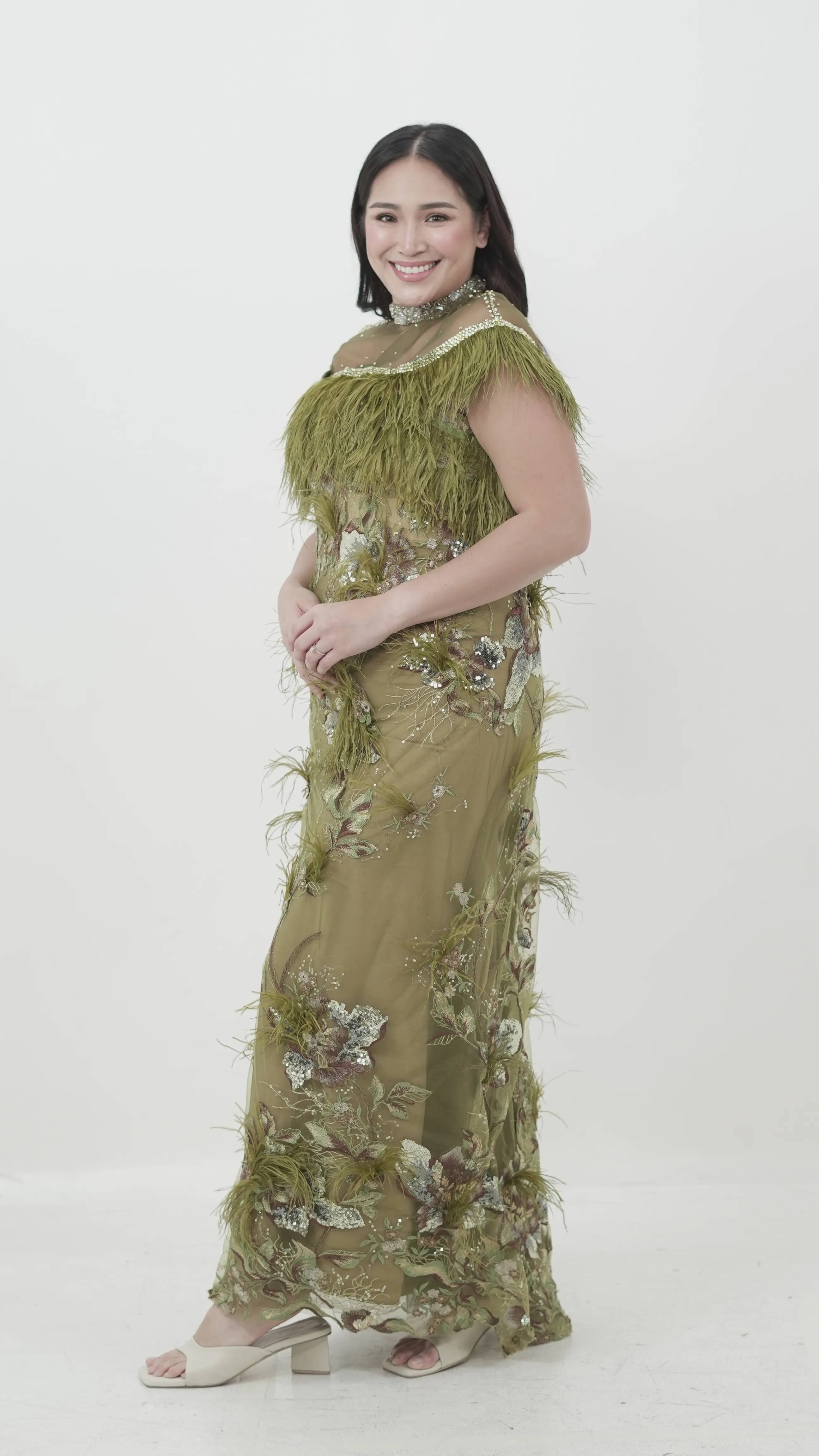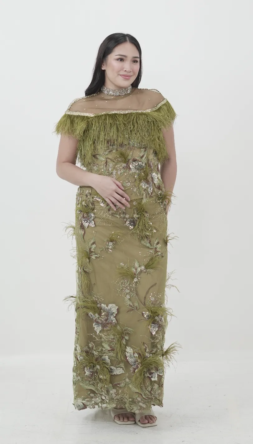 Olive Green Embroidered Feather Gown