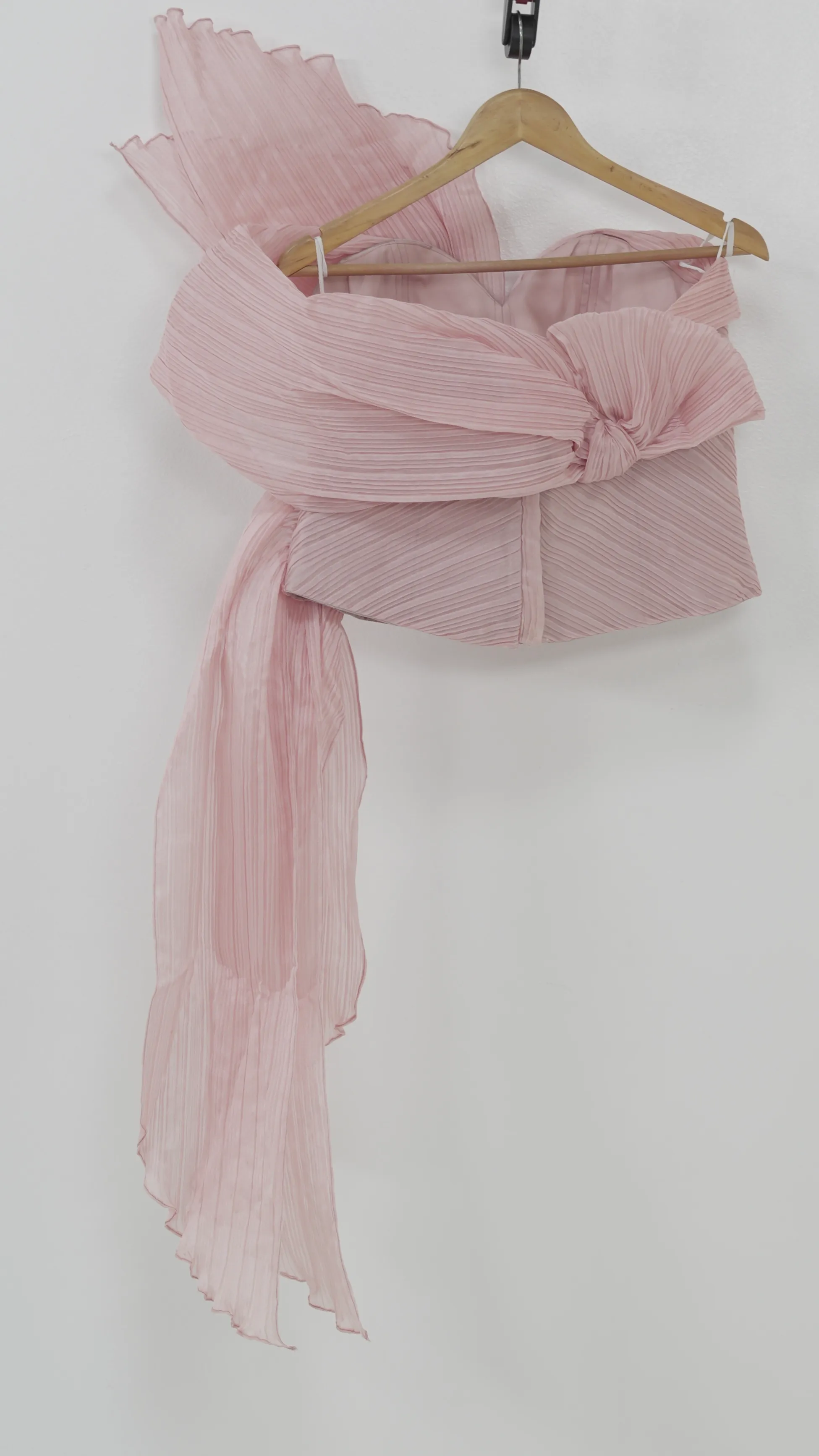 A dramatic one-shoulder top in blush pink with pleated chiffon fabric, gathered into a crystal-encrusted centerpiece. The cascading sheer sash adds volume and texture, creating a sculptural, high-fashion finish.