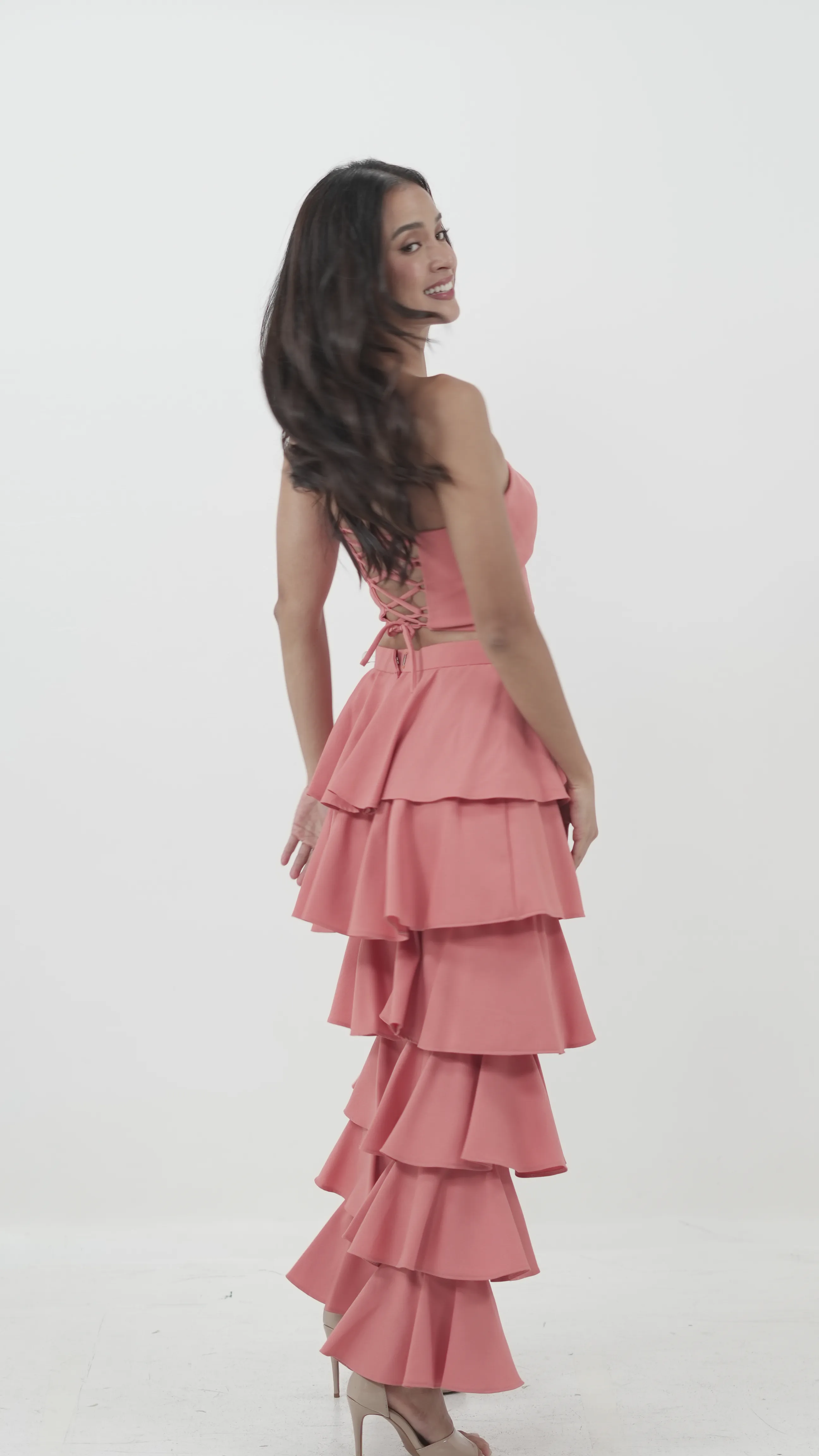 Make a bold entrance in this playful pink two-piece set, featuring a bandeau-style crop top with lace-up back detail and dramatic multi-tiered ruffle pants. Perfect for summer parties or standout shoots.