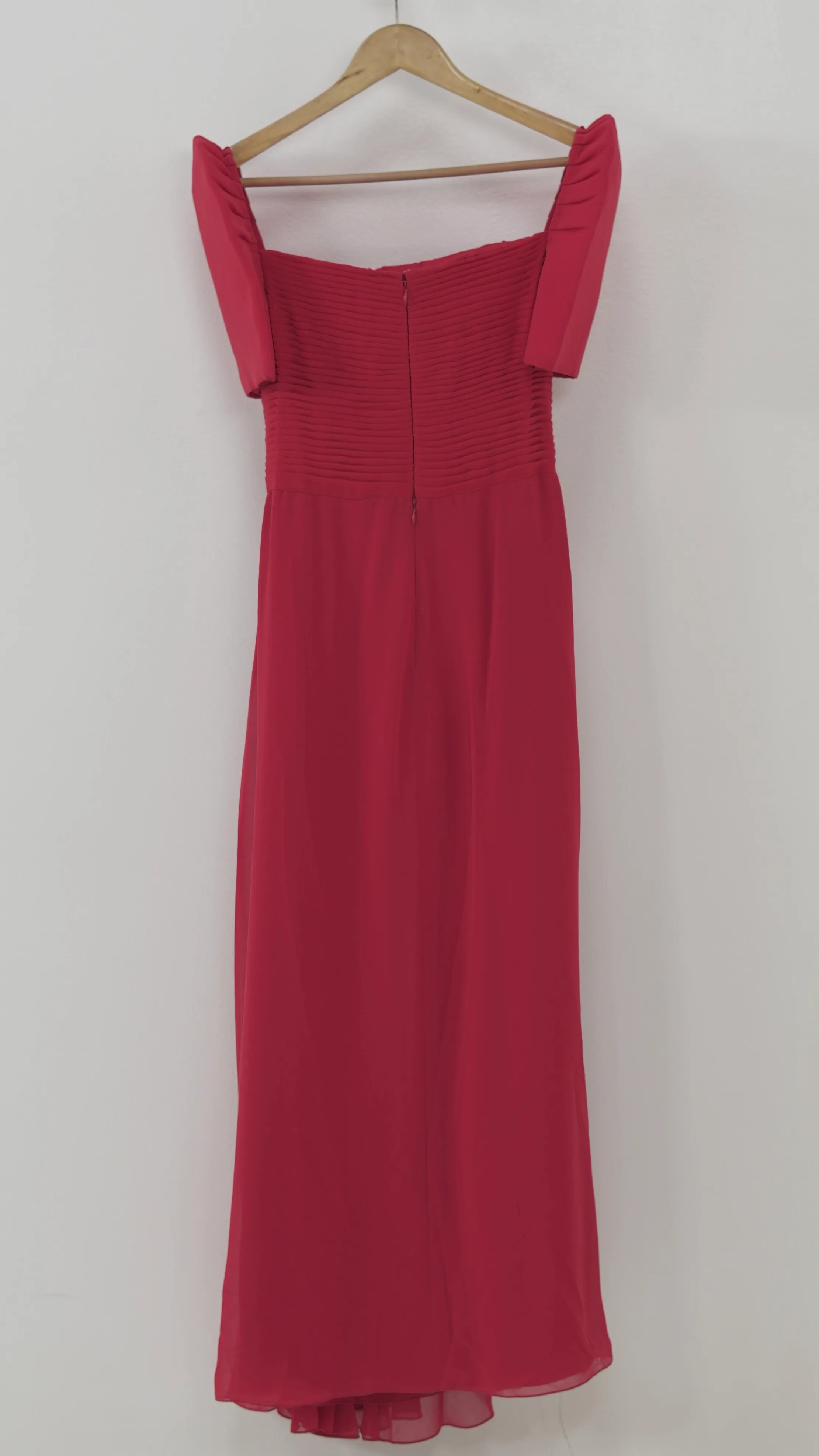 This ruby A lightweight, apple green slip dress with thin straps and soft layered ruffles across the chest. The fluid fabric and simple silhouette give this piece an effortless and playful charm.red chiffon gown features a ruched bodice, short off-shoulder sleeves, and a flowy layered skirt. A jeweled brooch at the waist brings a touch of sparkle to this classic silhouette.