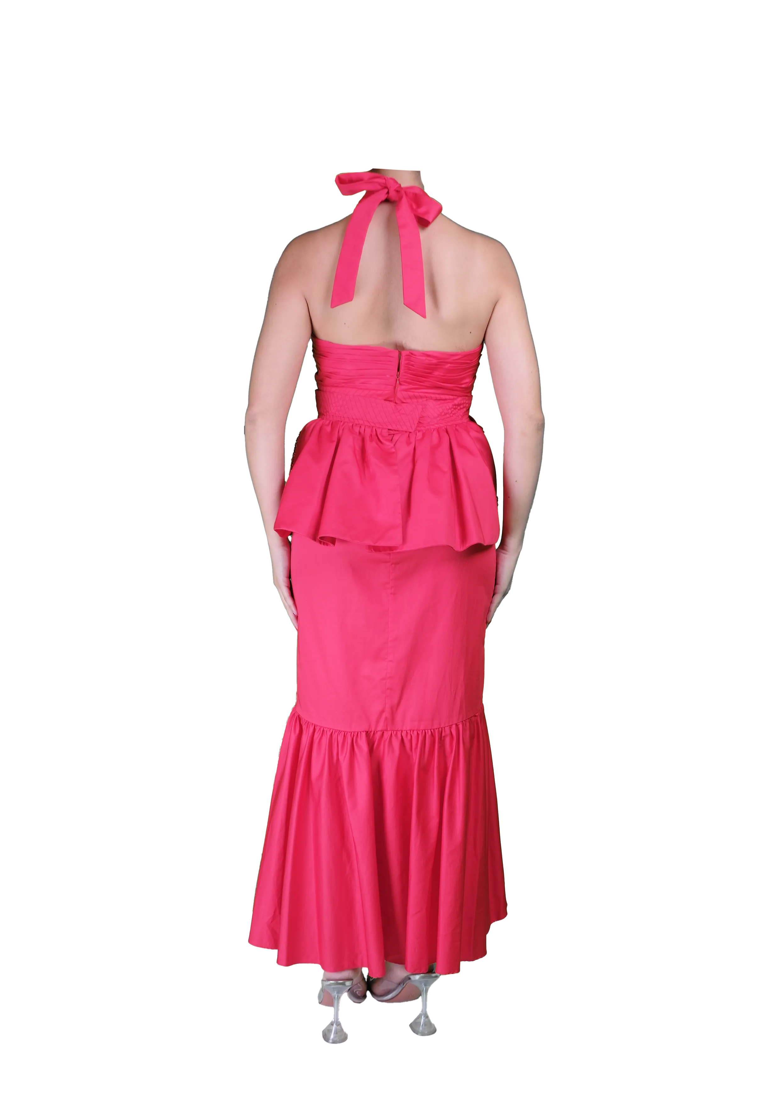 A bold red midi dress with a halter neckline, front cut-out, and button-down bodice. The gathered hemline adds movement, while the open back ties create a striking finish.A bold red midi dress with a halter neckline, front cut-out, and button-down bodice. The gathered hemline adds movement, while the open back ties create a striking finish.