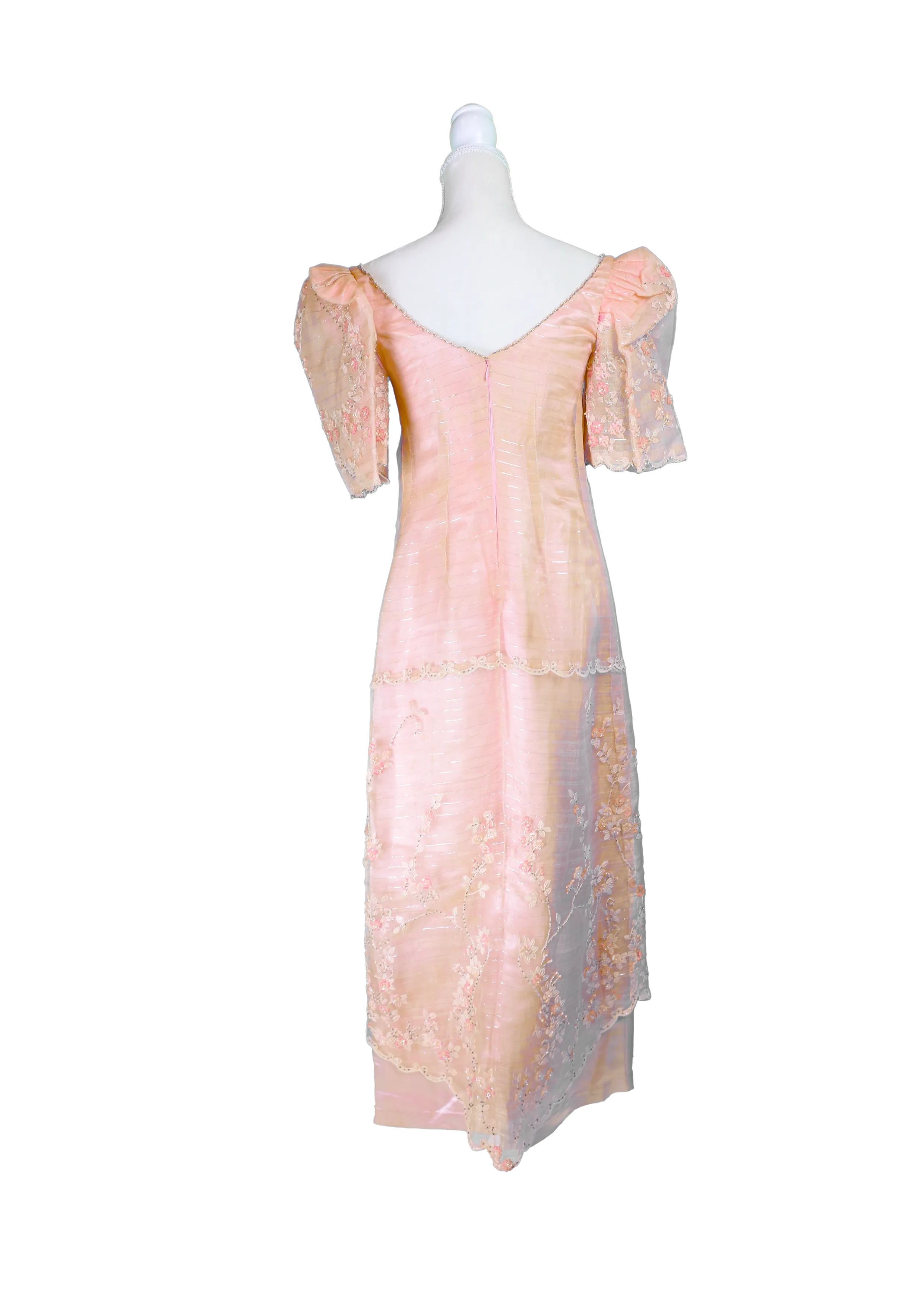A fitted gown in rose pink filipiniana brocade with structured short sleeves. The fabric is rich and