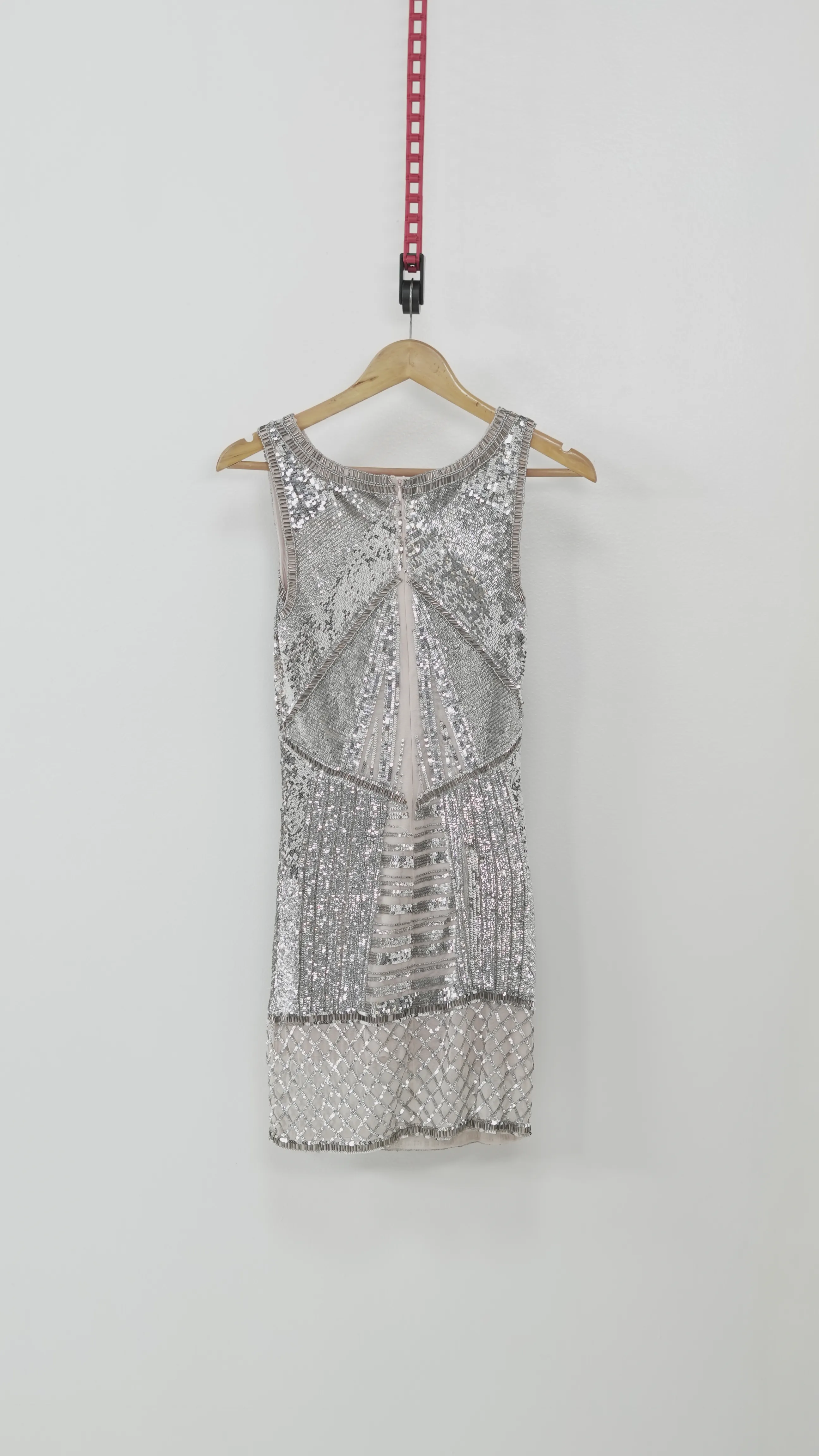 Shimmer and shine in this silver sleeveless mini dress, encrusted with sequins in a geometric pattern. The semi-sheer hem adds a touch of flirtiness for a fun night out.