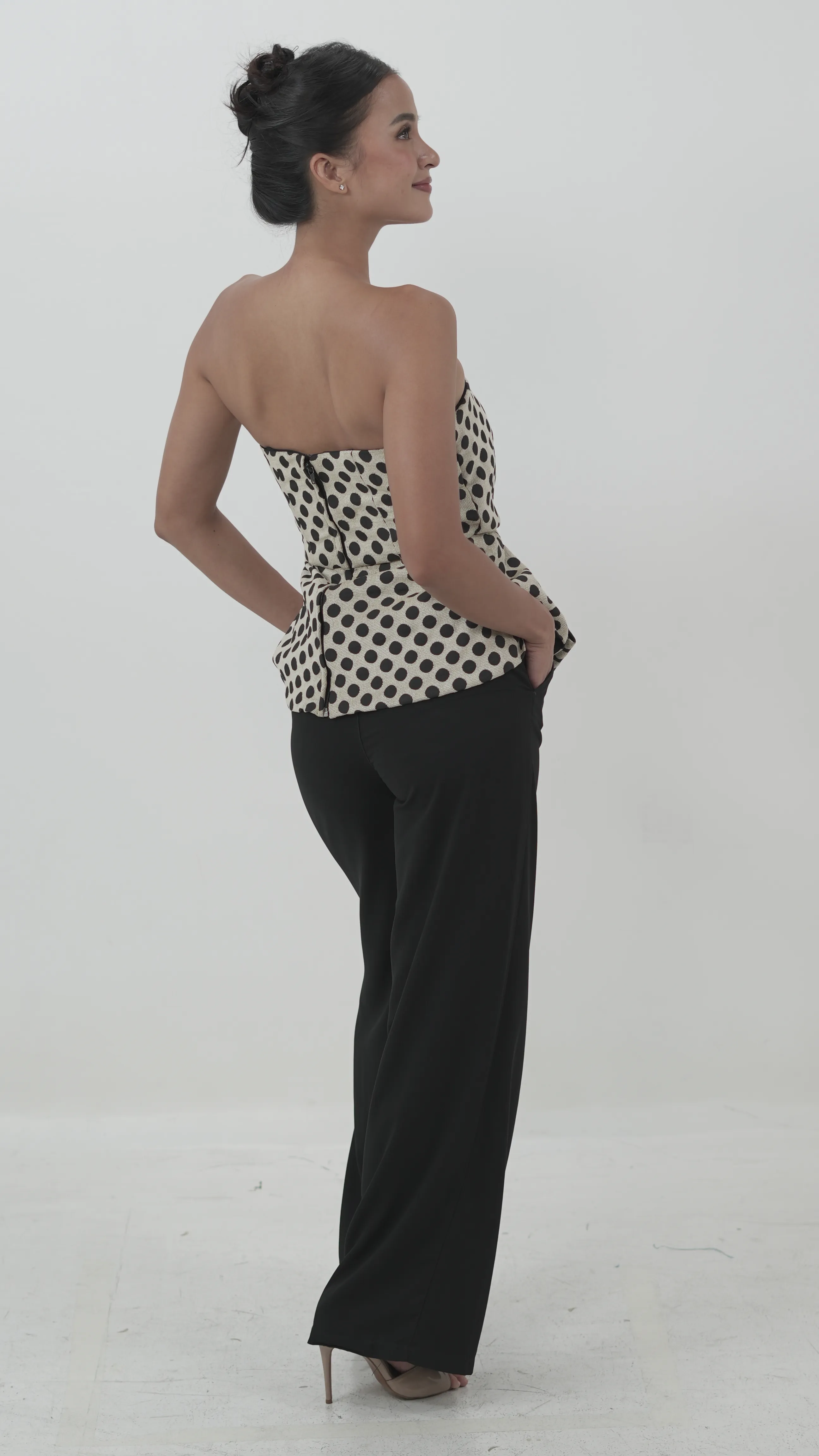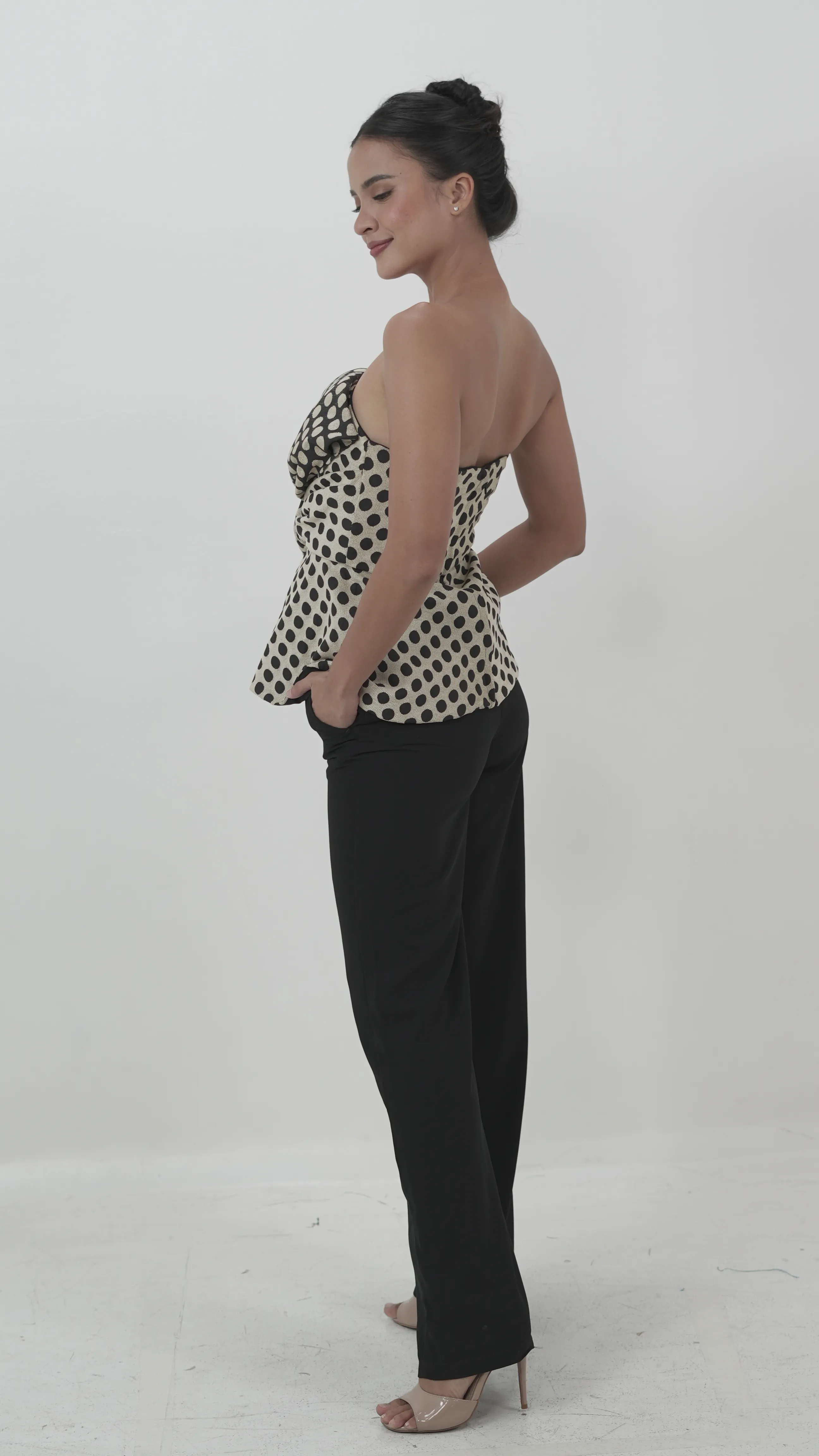 Bold and playful, this strapless piece pairs a neutral polka dot print with a dramatic oversized bow. The structured shape and textured fabric give it a sculpted yet feminine edge.BRAND: VANIA ROMOFFFITS: S