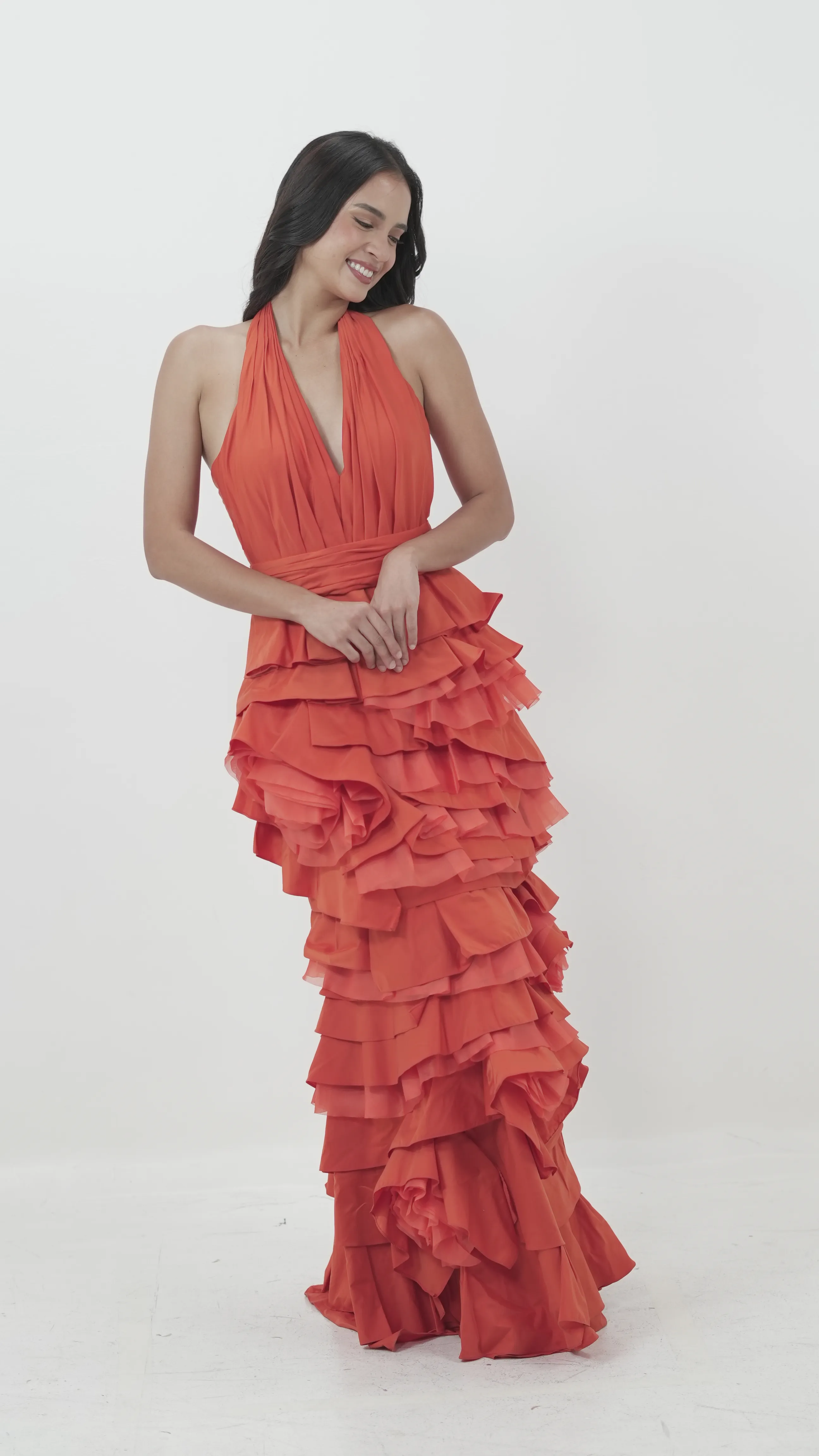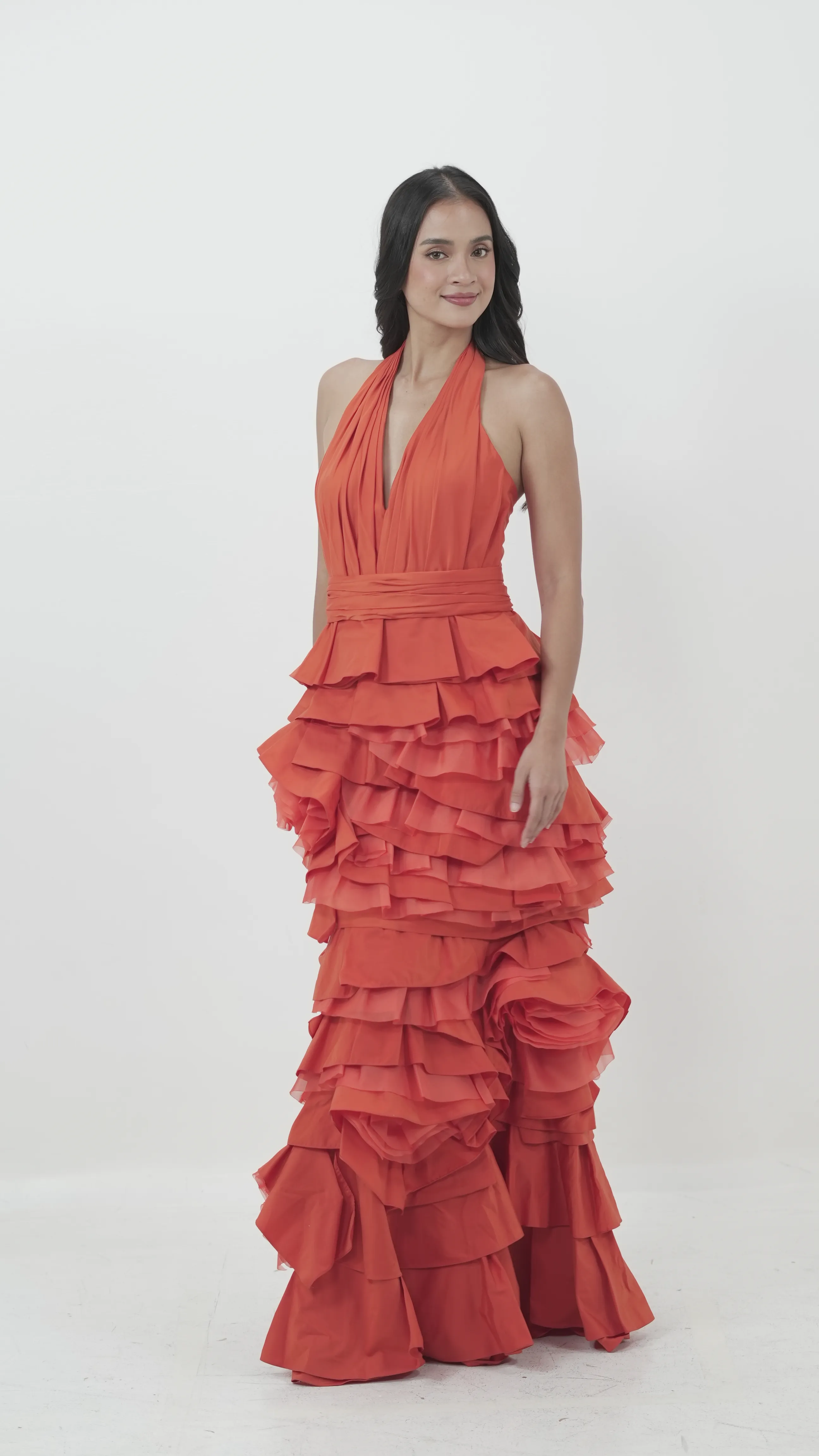 Vibrant and voluminous, this halter-neck gown is crafted from layers of ruffled tangerine fabric. It cinches at the waist and flows into a dramatic tiered skirt.BRAND: STEPH TANFITS: S