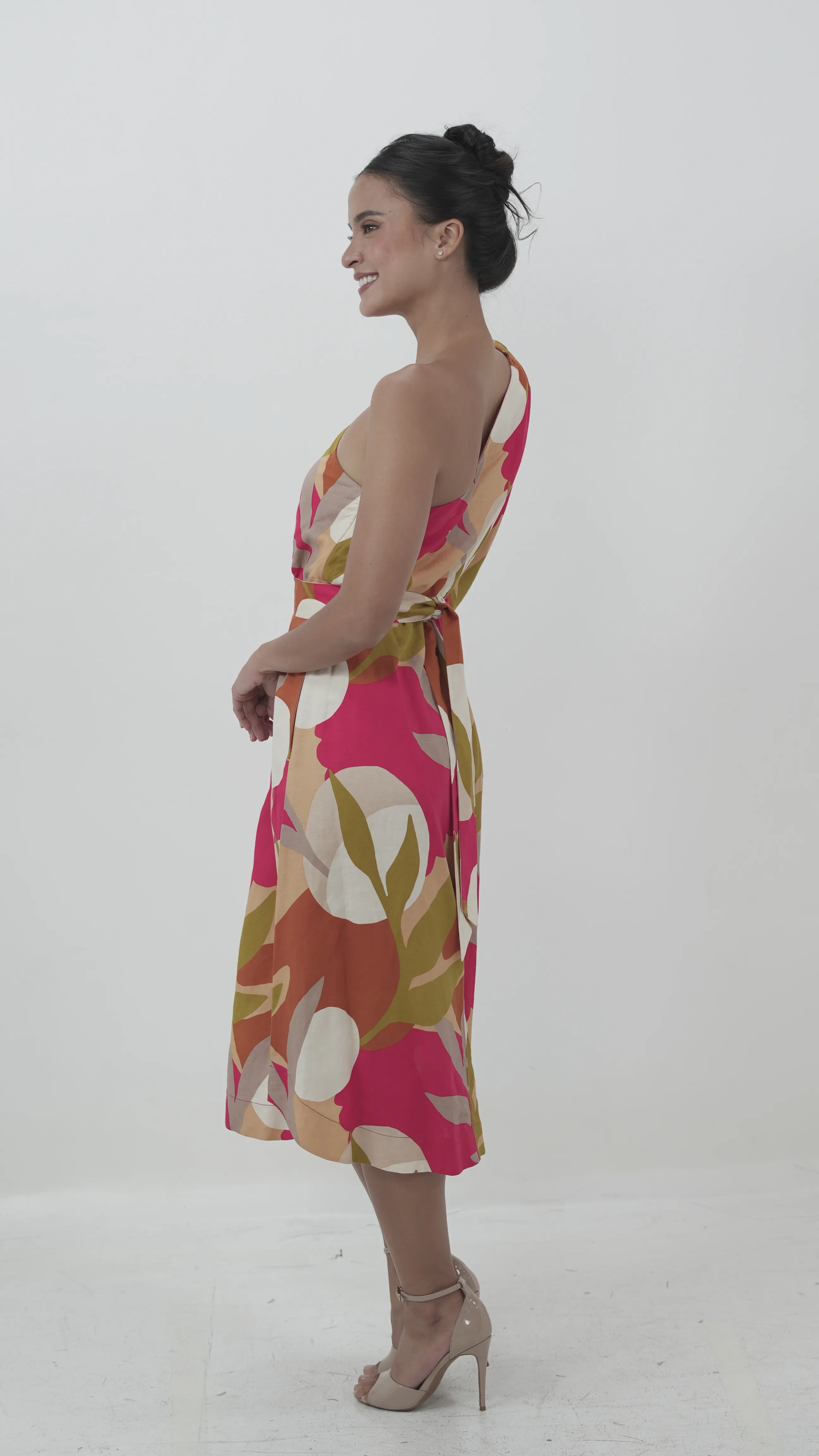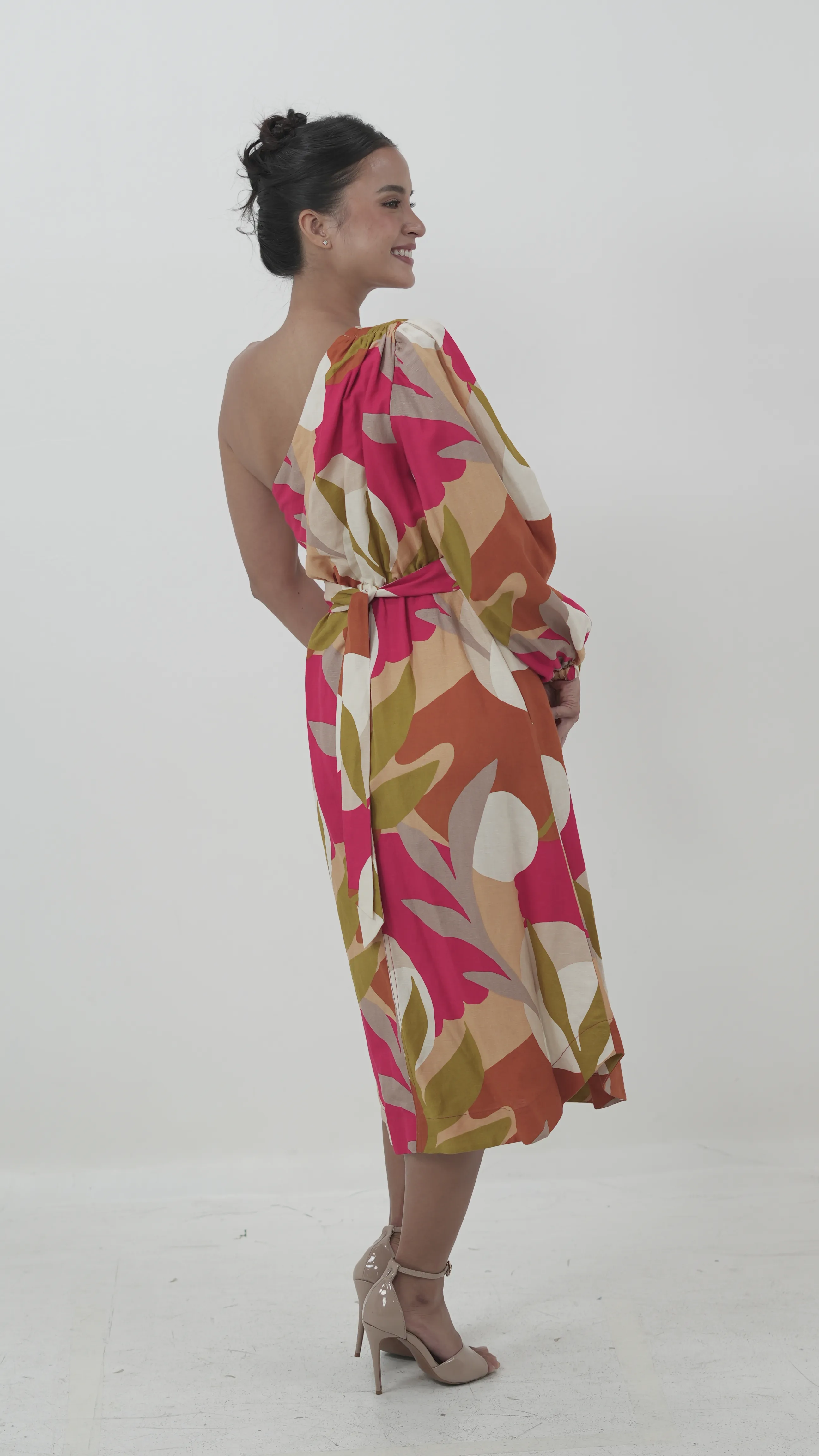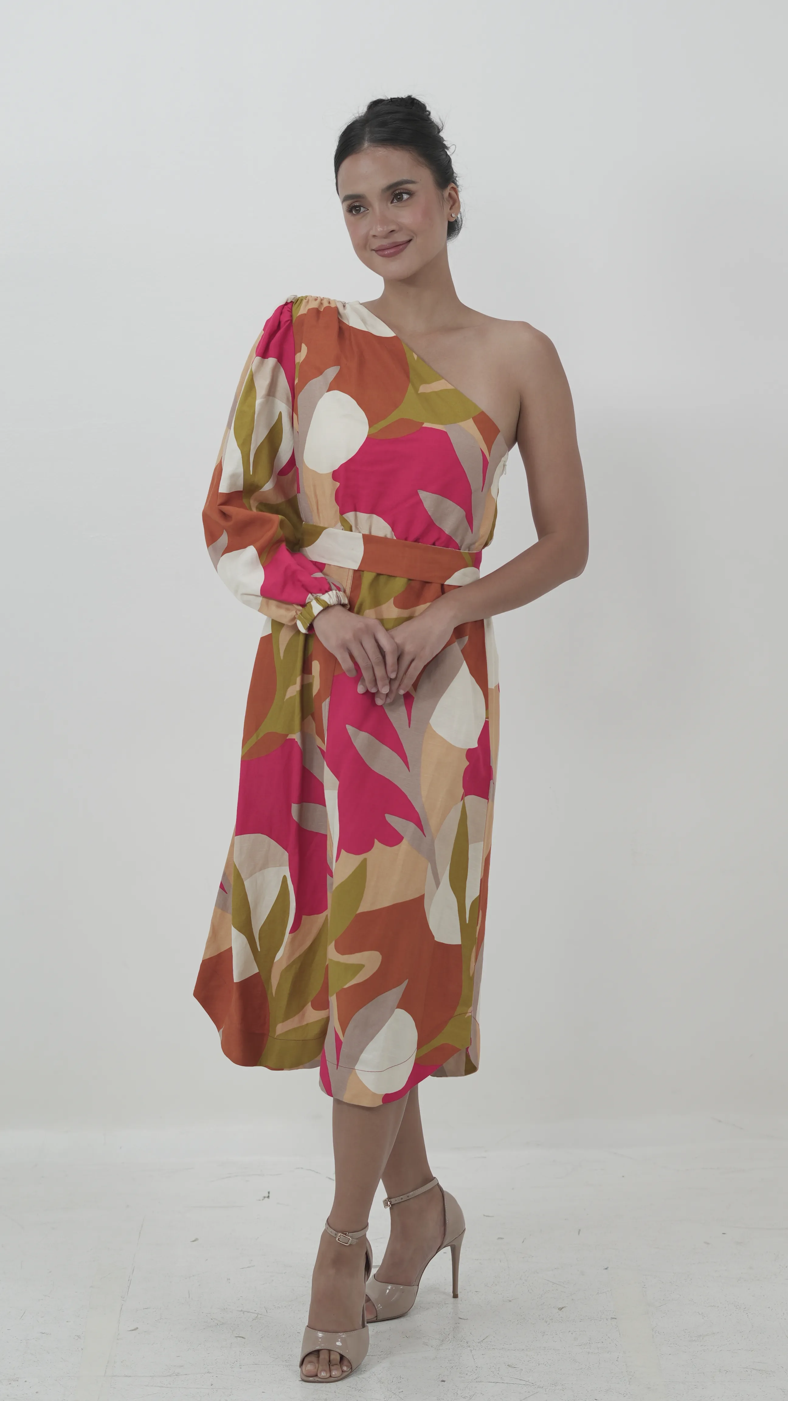 A vibrant, one-shoulder midi dress with a bold leaf print in hues of pink, orange, olive, and cream. The puffed sleeve and structured waistband highlight the silhouette while adding a modern twist to the playful pattern.