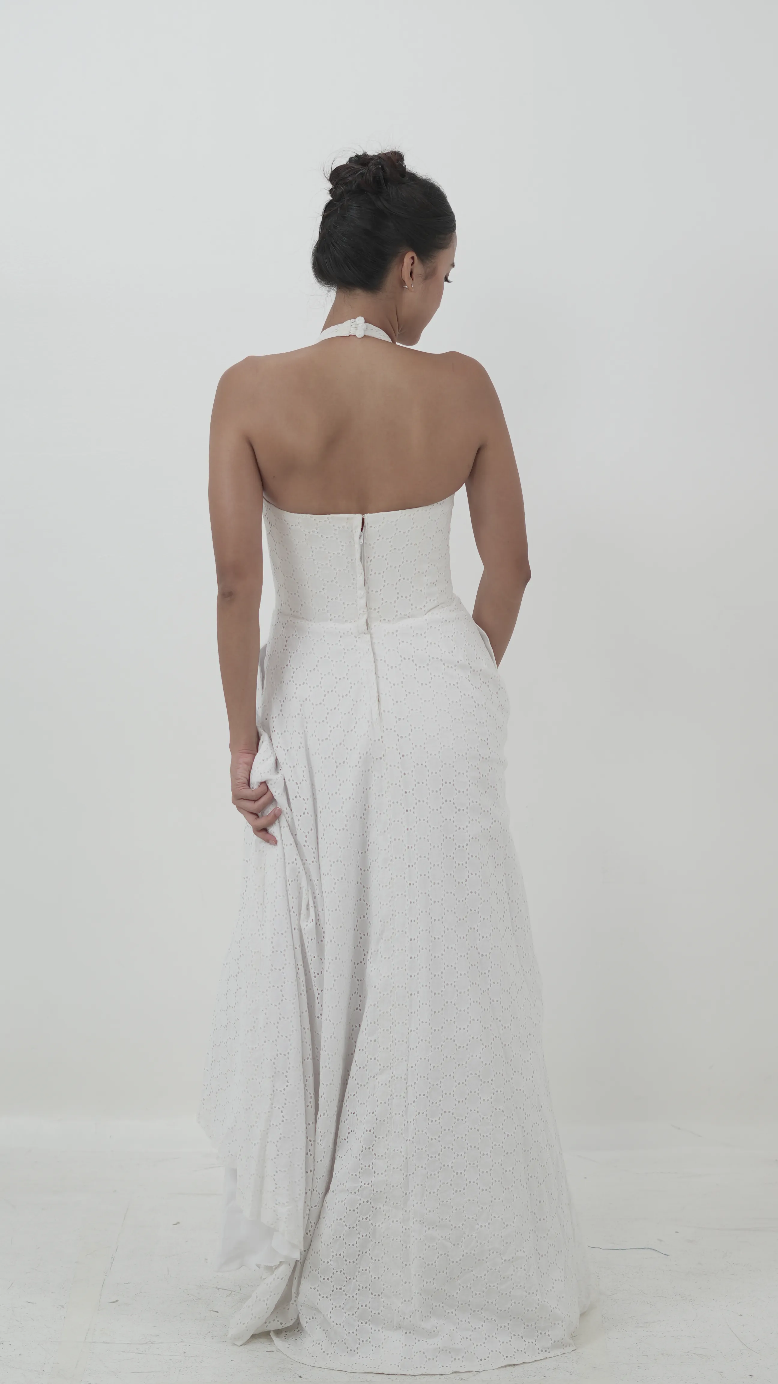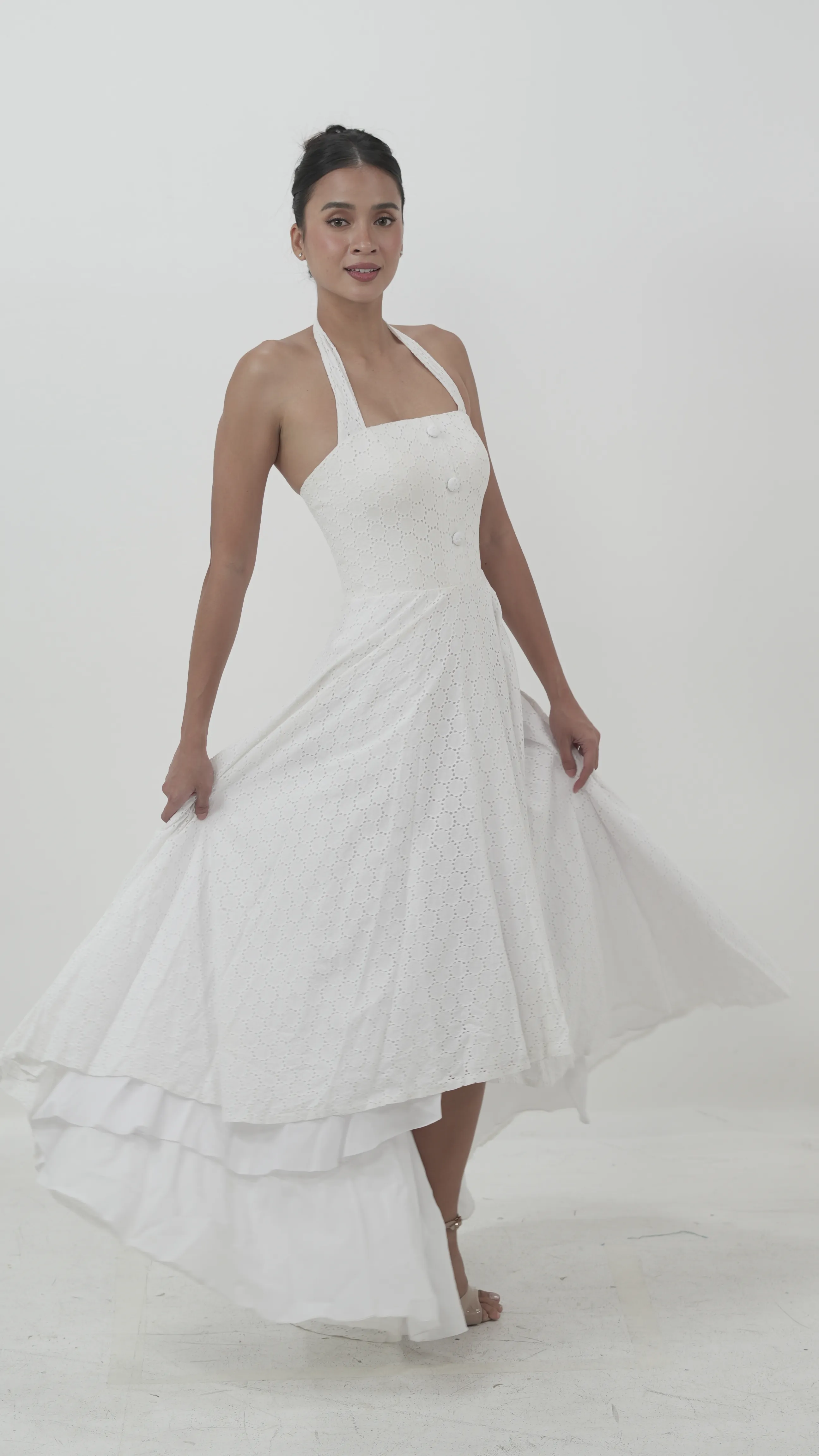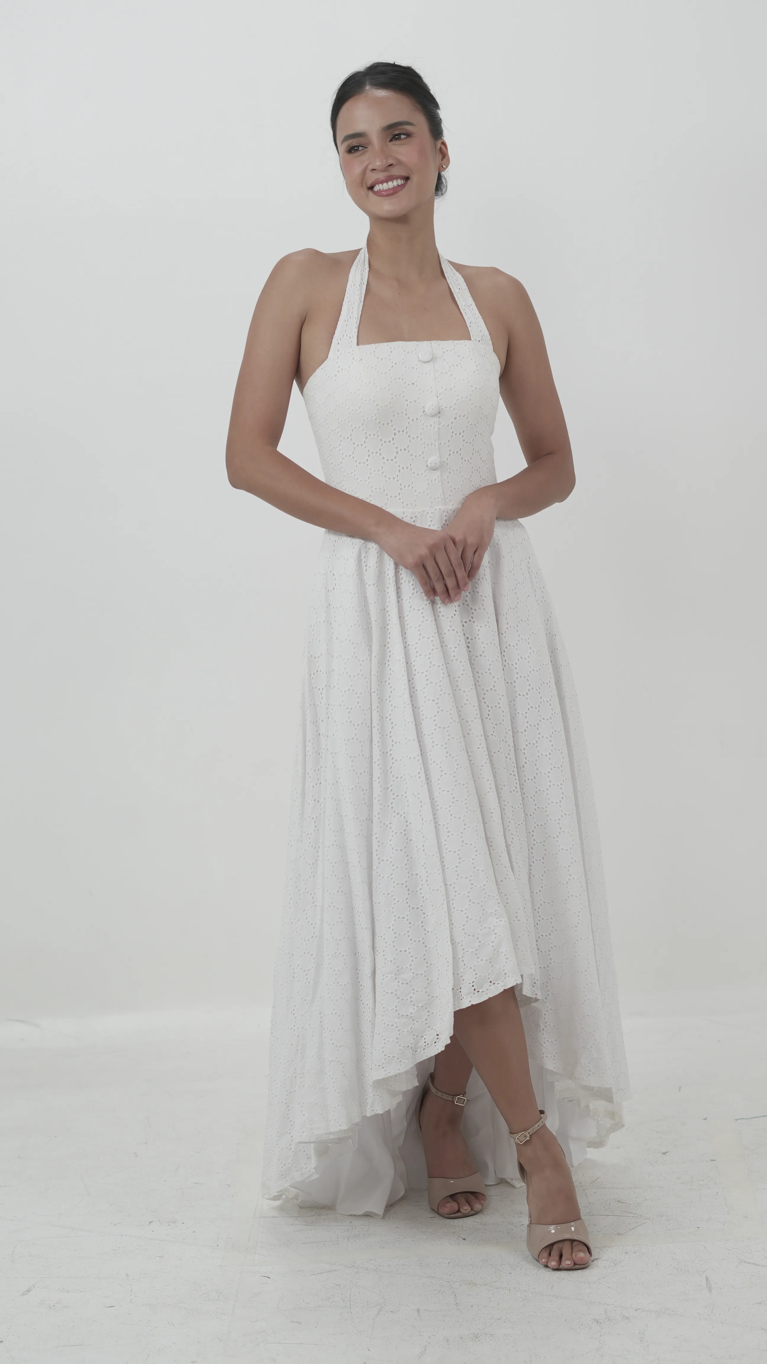 A halter-style dress crafted from white embroidered eyelet fabric, featuring a square neckline and fabric-covered buttons down the bodice. The silhouette is fitted at the waist and flows into a soft high-low hemline, blending structured charm with light, airy movement.