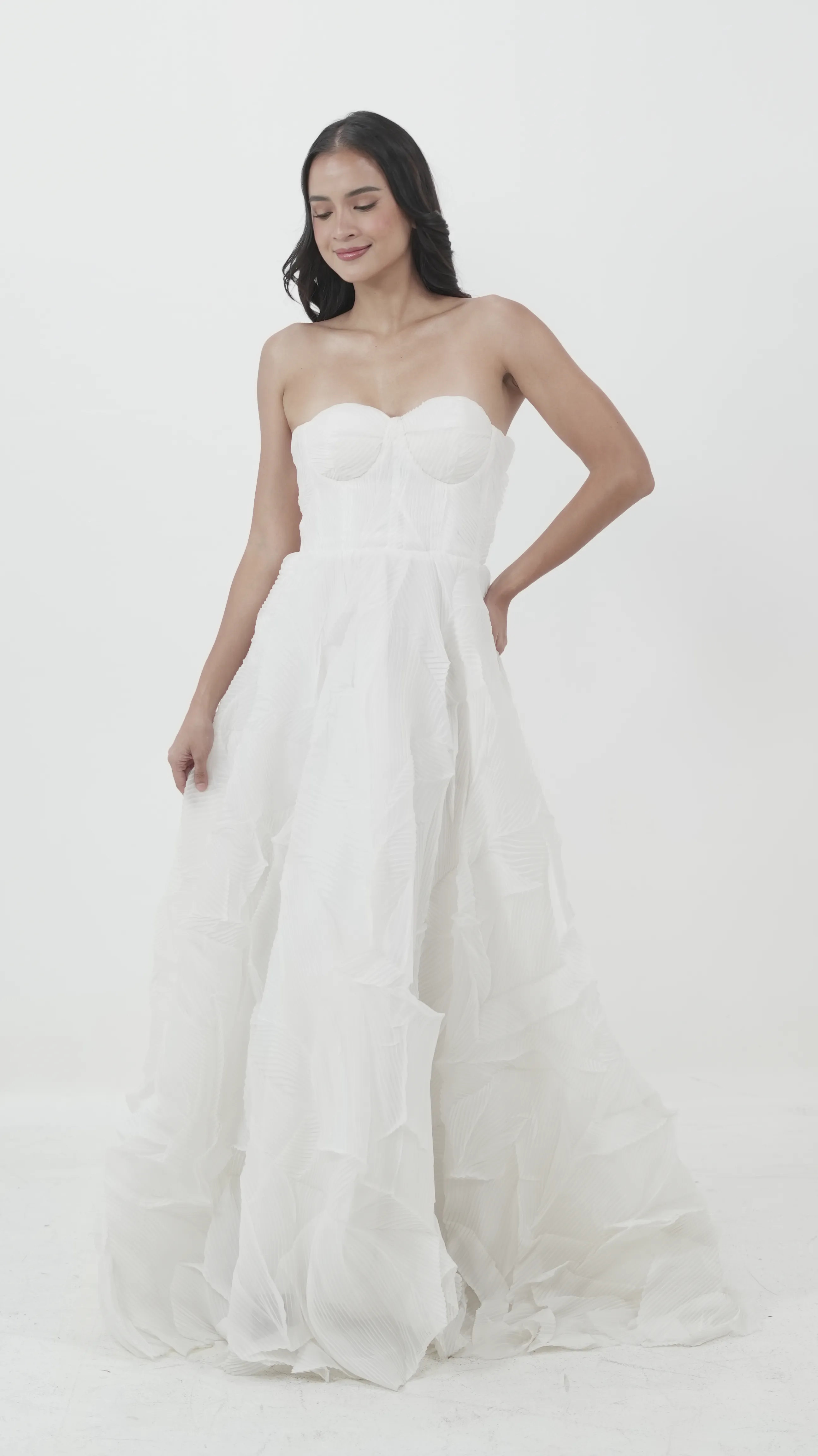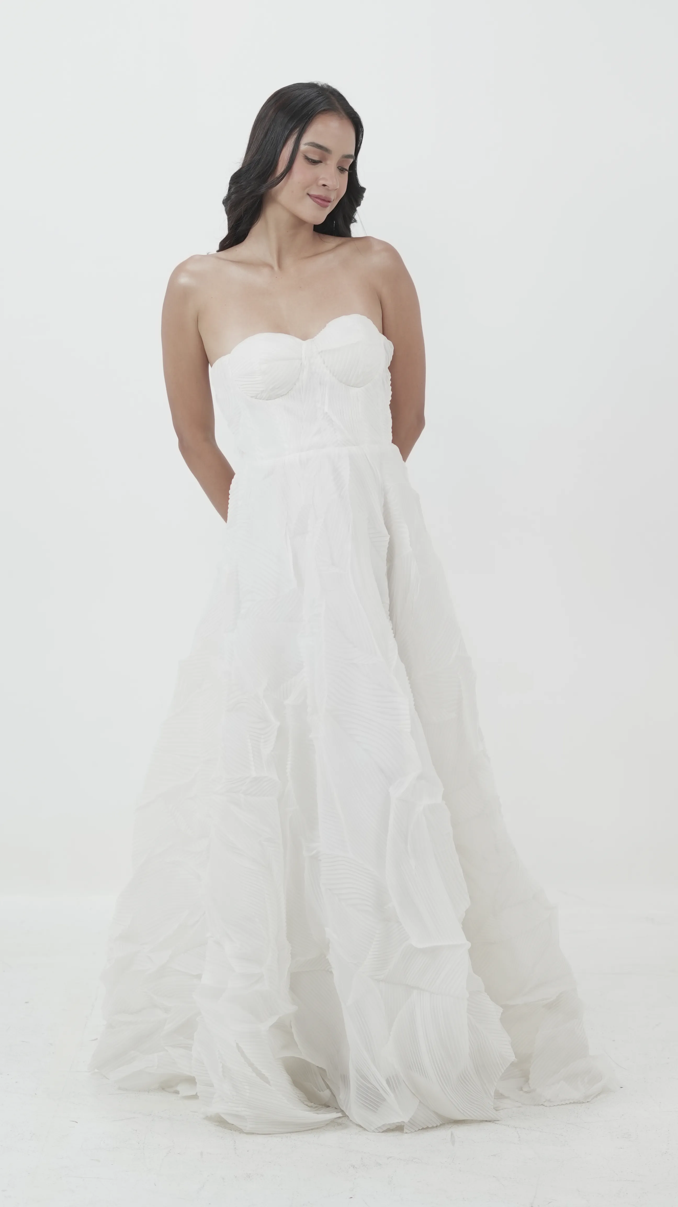 This elegant white gown features a structured bodice and soft pleated organza-like fabric forming layered waves down the skirt. Strapless with subtle boning, it’s ideal for modern brides or white-themed galas.
