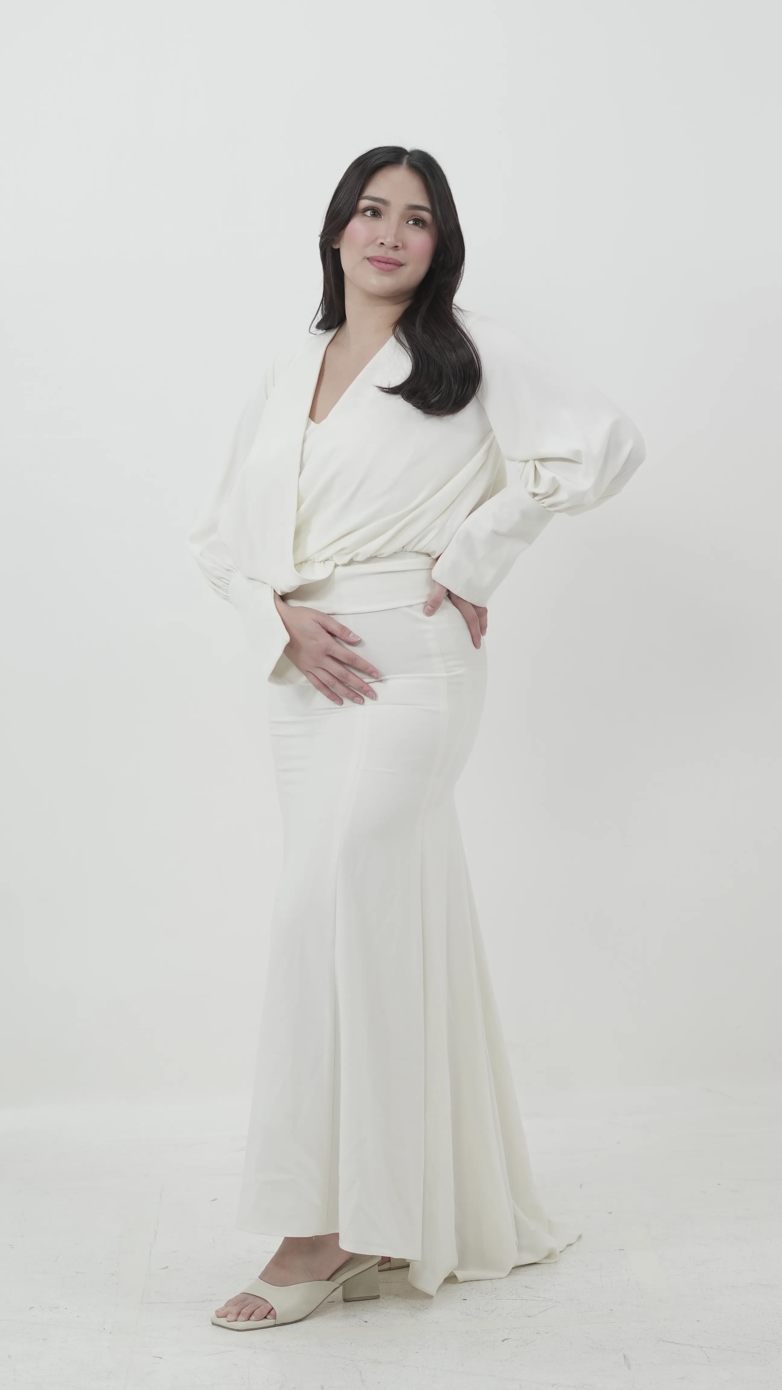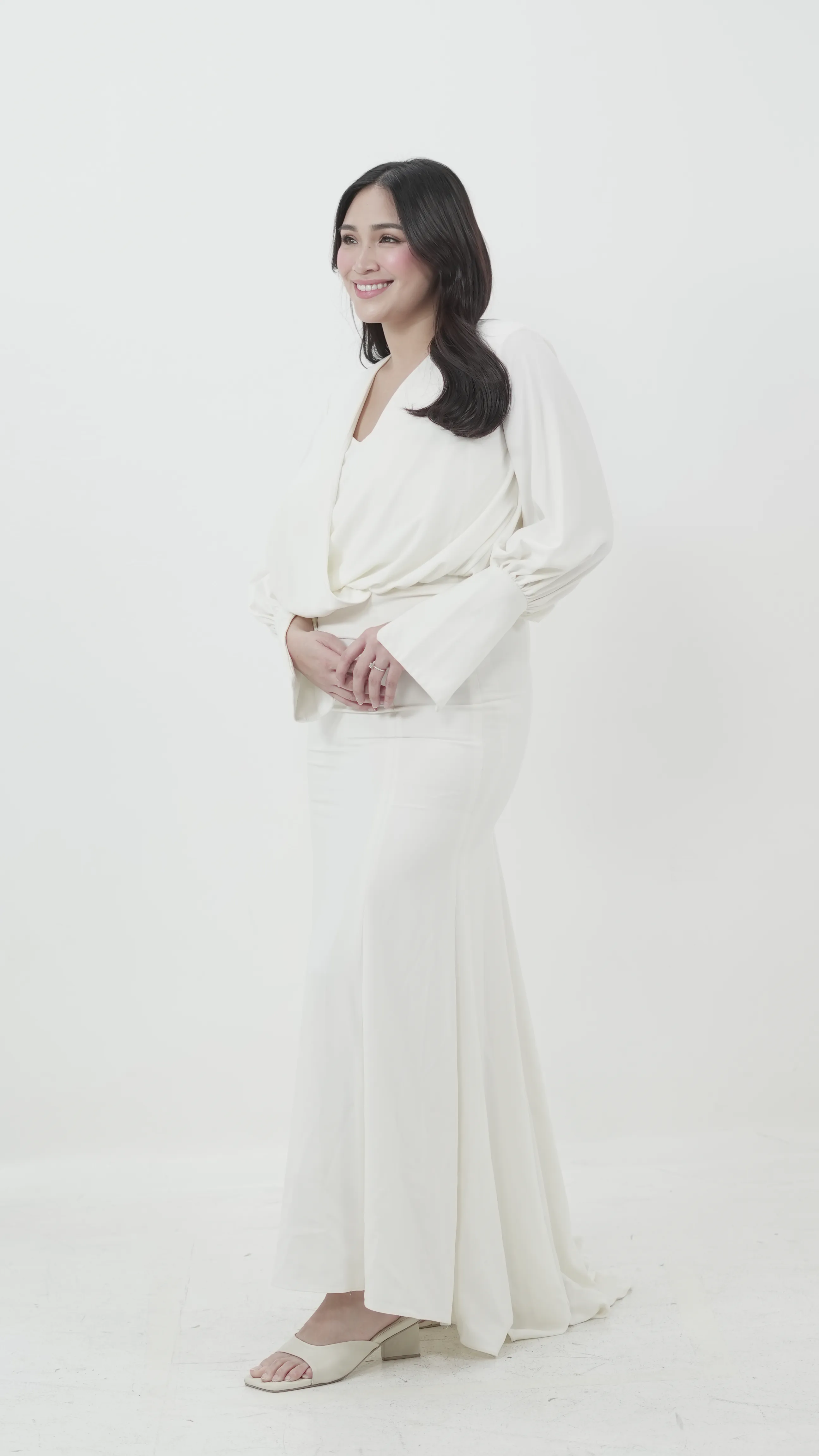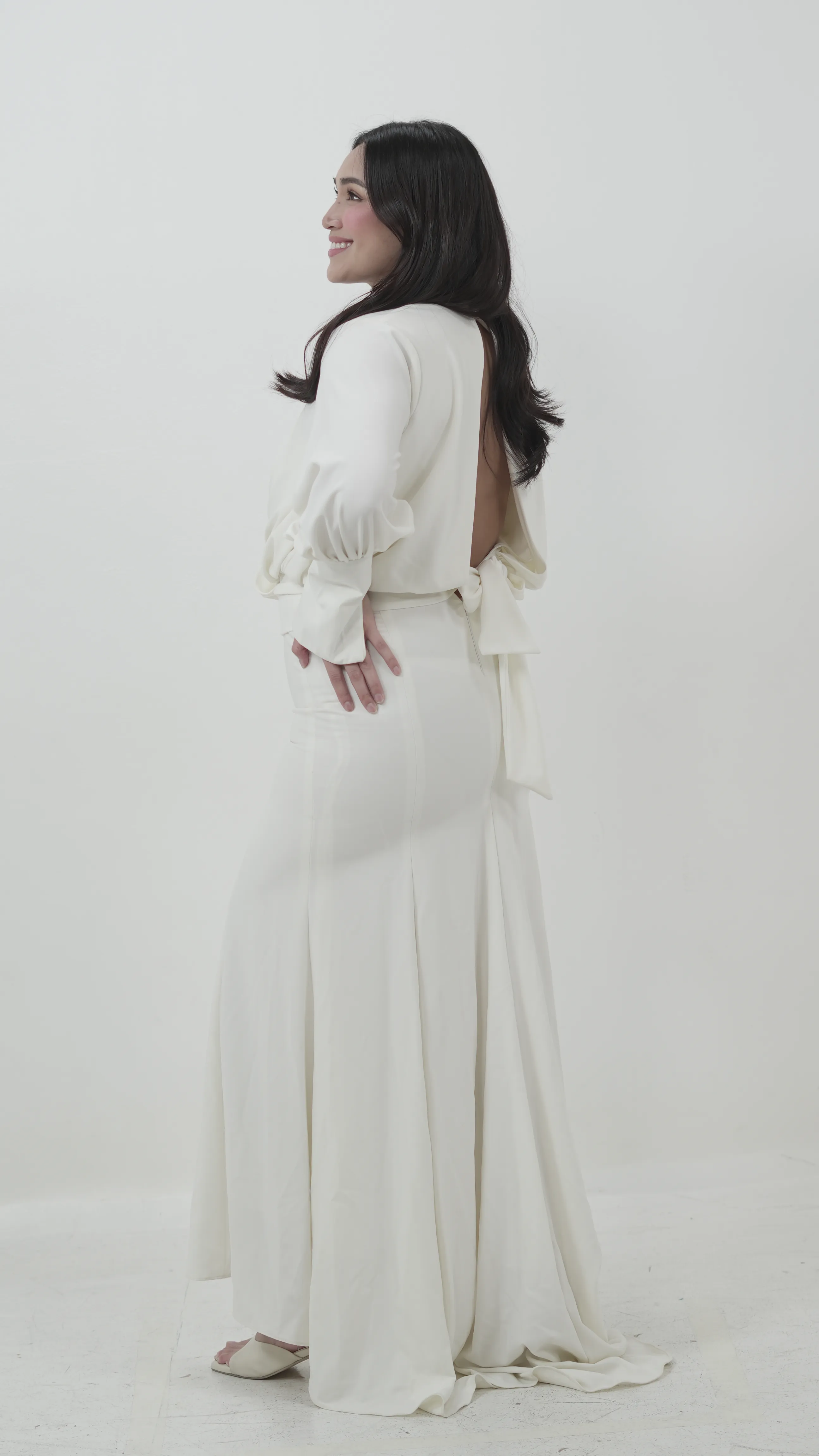 Elegant in its simplicity, this long-sleeve white gown has a soft wrap neckline, subtle train, and dramatic open back with a tie detail. A refined and timeless option for formal occasions or minimalist brides.